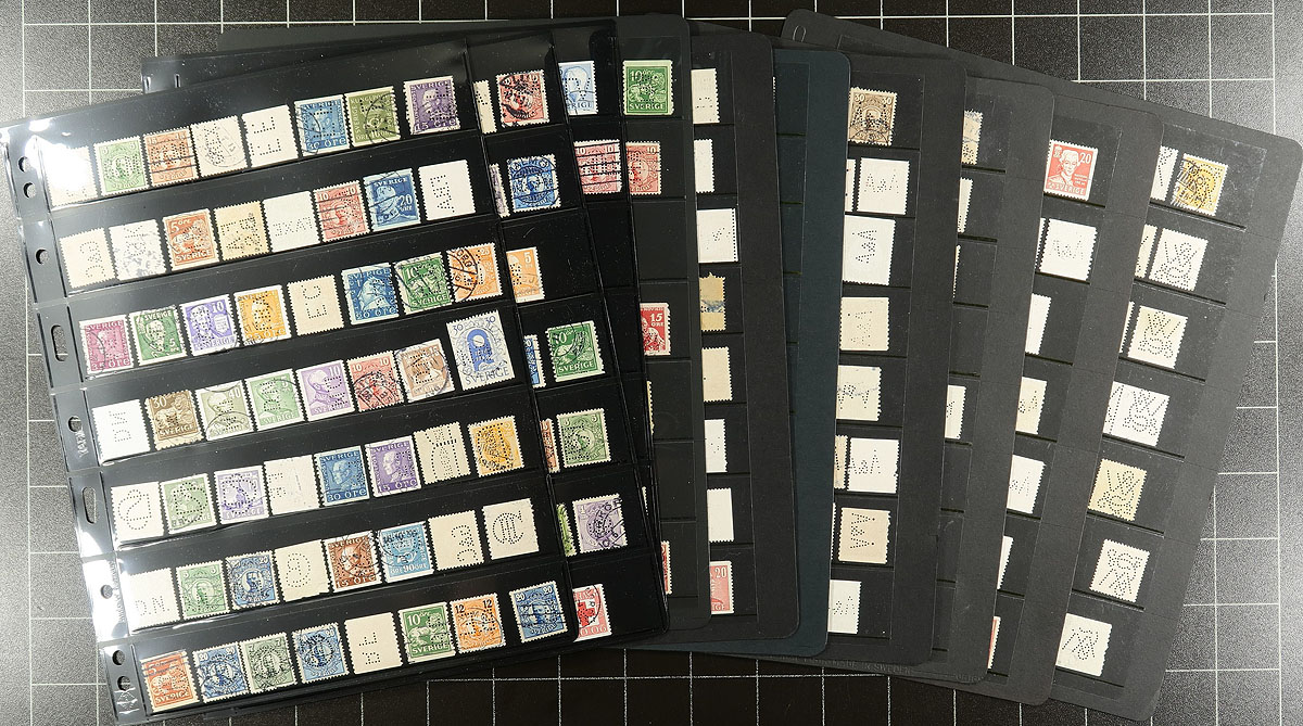 Accumulation of roughly 725 Sweden private perfins, 1890's-1950 on 13 stock pages. The lot is generally organized alphabetically by company, noting various 88 positions, types, stamp issues, etc., and unchecked for varieties. A nice lot for the specialist as we do not normally come across these in this quantity. All pages shown online. Estimate =