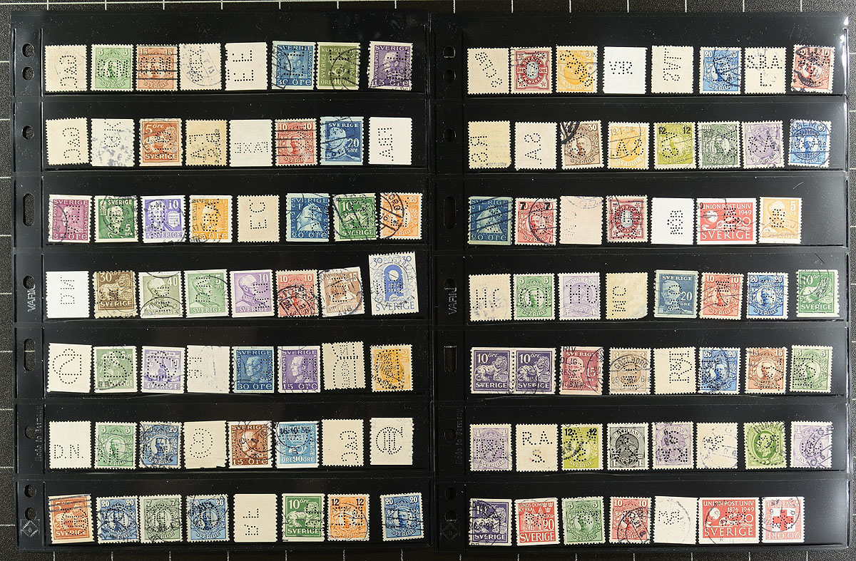 Accumulation of roughly 725 Sweden private perfins, 1890's-1950 on 13 stock pages. The lot is generally organized alphabetically by company, noting various 88 positions, types, stamp issues, etc., and unchecked for varieties. A nice lot for the specialist as we do not normally come across these in this quantity. All pages shown online. Estimate =