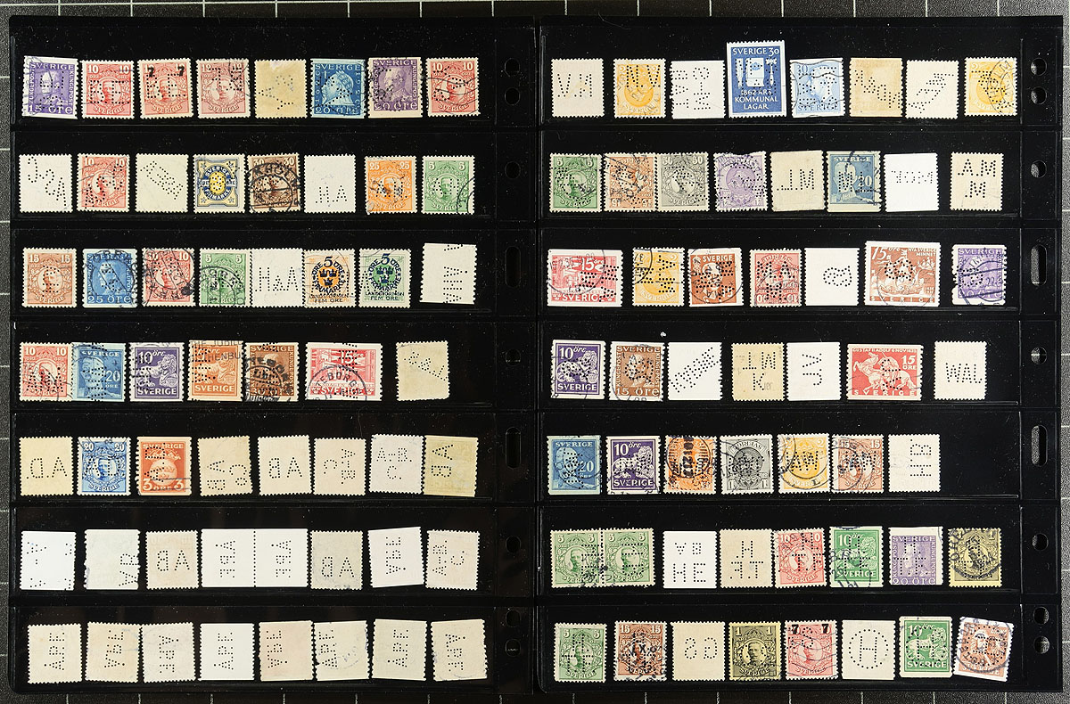 Accumulation of roughly 725 Sweden private perfins, 1890's-1950 on 13 stock pages. The lot is generally organized alphabetically by company, noting various 88 positions, types, stamp issues, etc., and unchecked for varieties. A nice lot for the specialist as we do not normally come across these in this quantity. All pages shown online. Estimate =