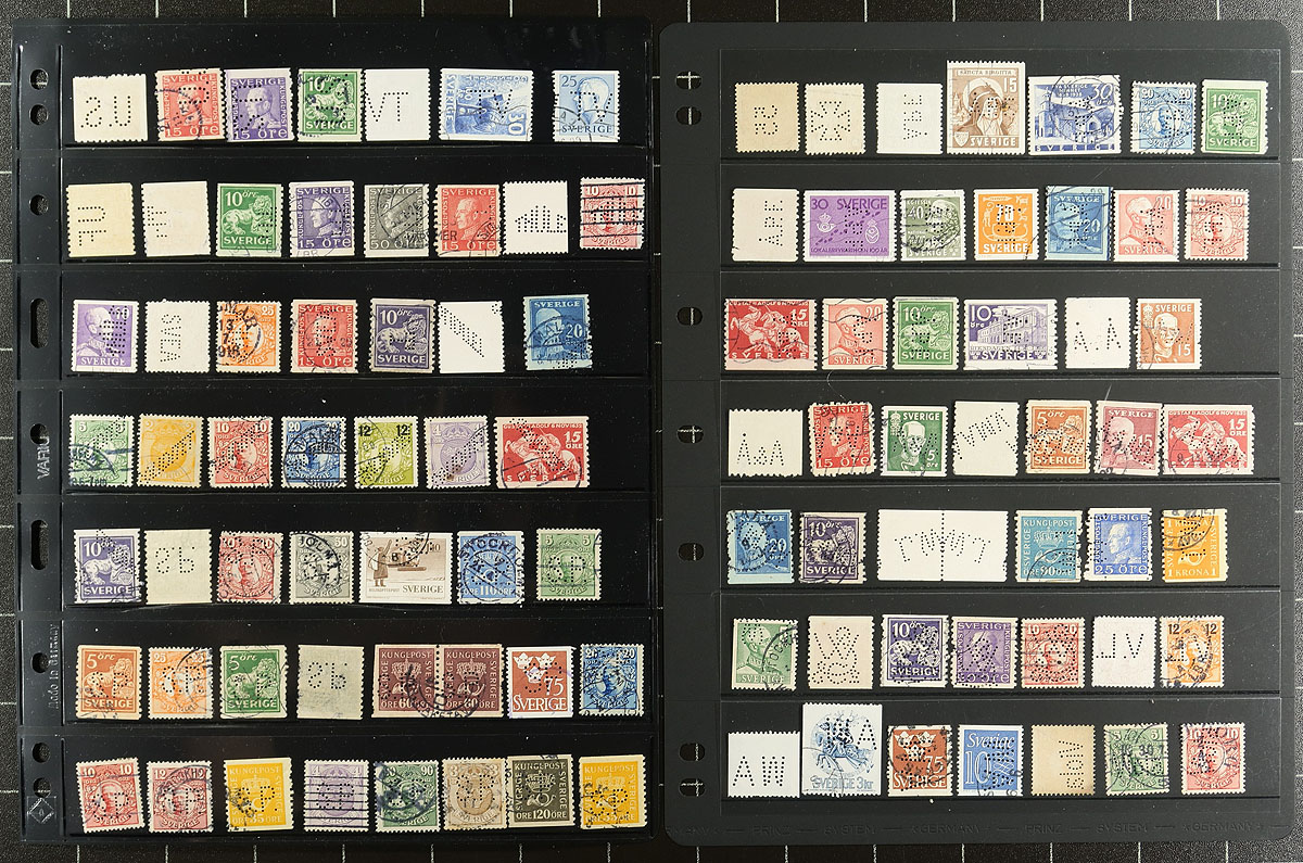 Accumulation of roughly 725 Sweden private perfins, 1890's-1950 on 13 stock pages. The lot is generally organized alphabetically by company, noting various 88 positions, types, stamp issues, etc., and unchecked for varieties. A nice lot for the specialist as we do not normally come across these in this quantity. All pages shown online. Estimate =