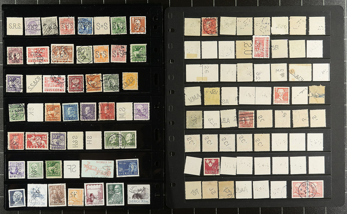 Accumulation of roughly 725 Sweden private perfins, 1890's-1950 on 13 stock pages. The lot is generally organized alphabetically by company, noting various 88 positions, types, stamp issues, etc., and unchecked for varieties. A nice lot for the specialist as we do not normally come across these in this quantity. All pages shown online. Estimate =