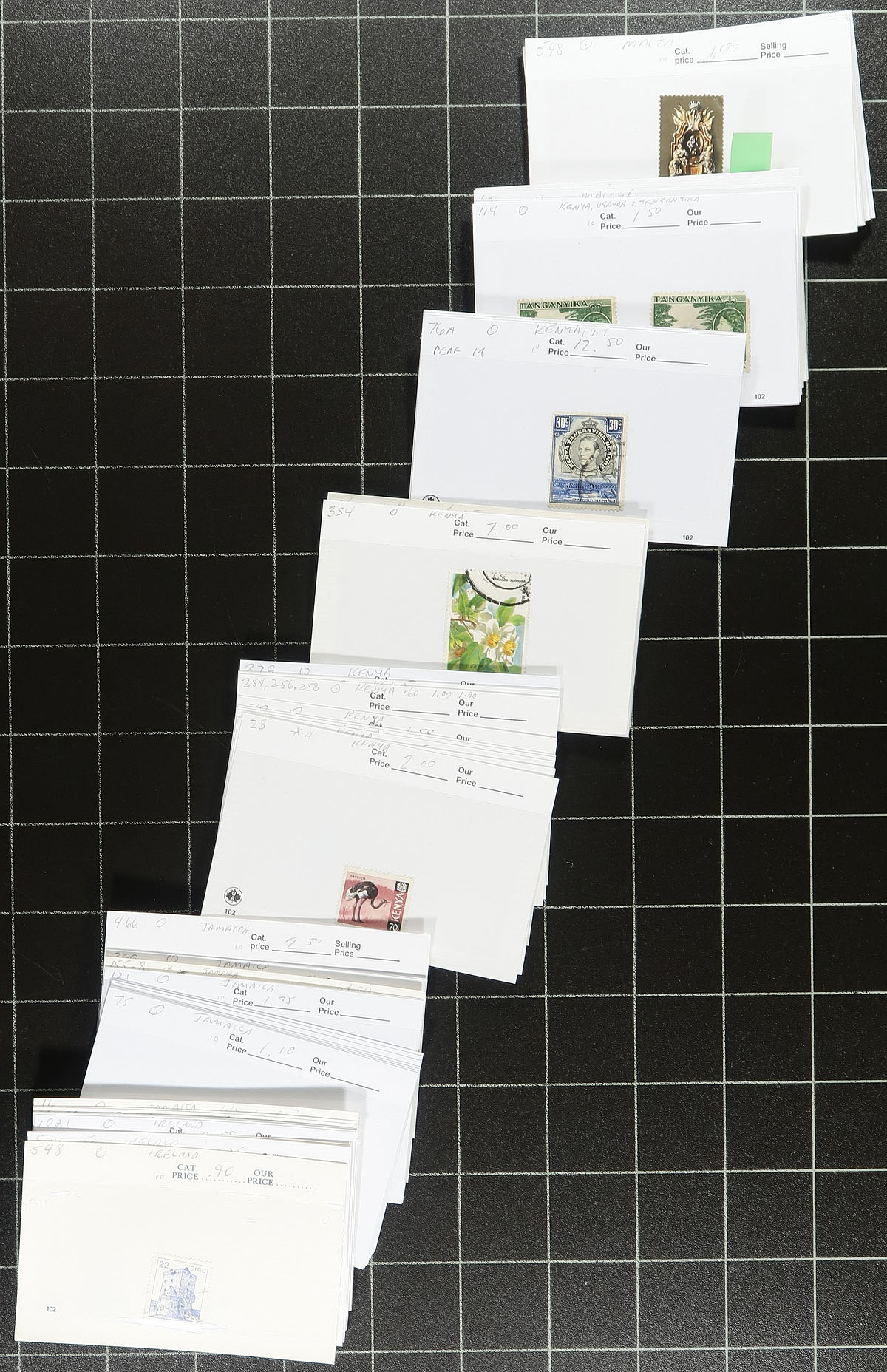 Lot of a few thousand primarily used worldwide stamps in roughly 1,000x 102 dealer cards, with material generally ranging from the 1900's to 1960's, with some material possible on either side of the given range. All the cards have been identified using Scott numbers and have older catalogue pricing, noting Great Britain and a few Commonwealth countries, some worldwide material and topicals (ships and planes stamps). Some of the better singles and sets have been identified by the owner with a tab, noting a few cataloguing in the $5 to $10 and up range. Stamps generally range from 1 to 5 per card. A fairly well organized lot which could have a few surprises. Estimate =