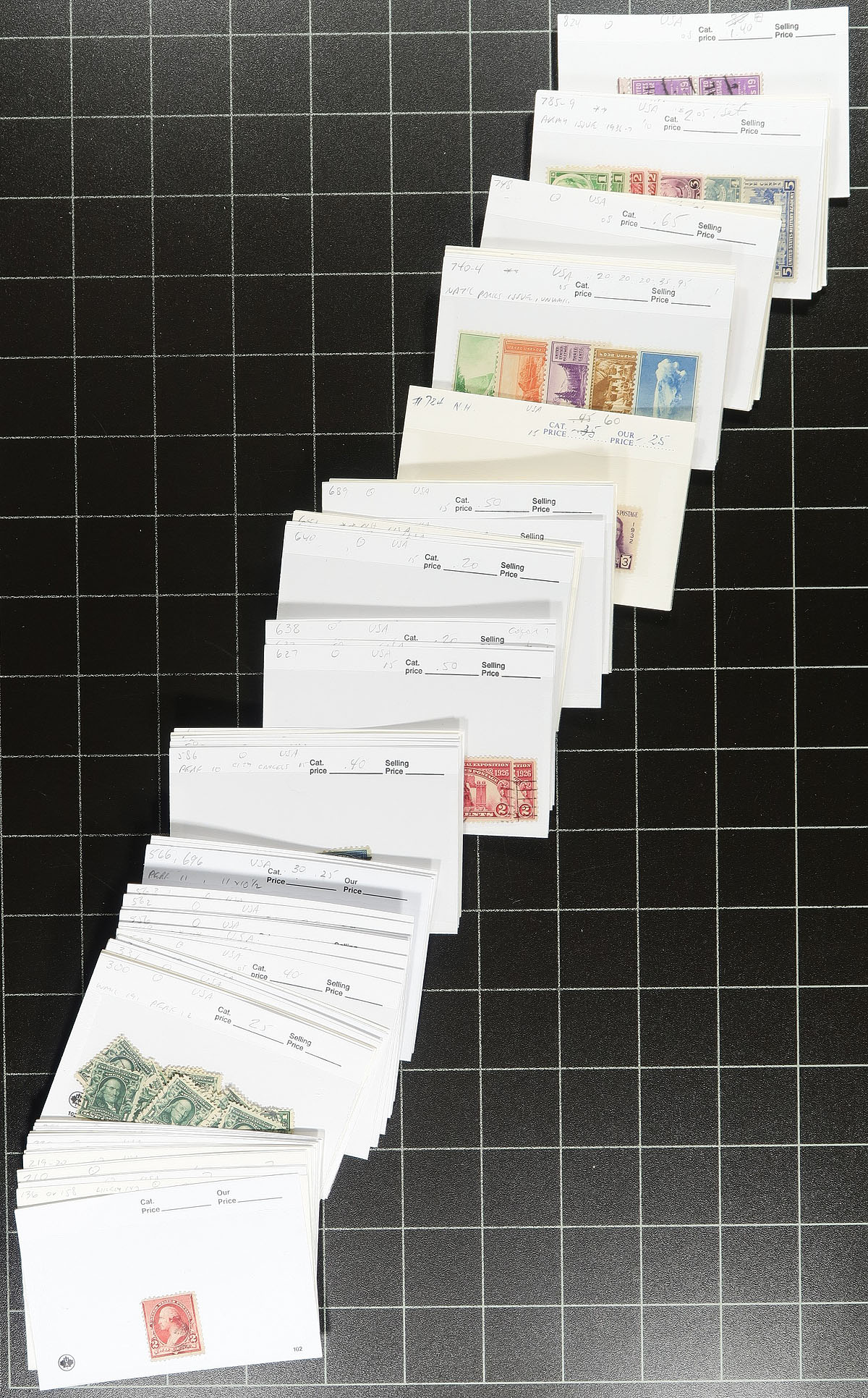 Lot of a few thousand primarily used worldwide stamps in roughly 1,000x 102 dealer cards, with material generally ranging from the 1900's to 1960's, with some material possible on either side of the given range. All the cards have been identified using Scott numbers and have older catalogue pricing, noting Great Britain and a few Commonwealth countries, some worldwide material and topicals (ships and planes stamps). Some of the better singles and sets have been identified by the owner with a tab, noting a few cataloguing in the $5 to $10 and up range. Stamps generally range from 1 to 5 per card. A fairly well organized lot which could have a few surprises. Estimate =