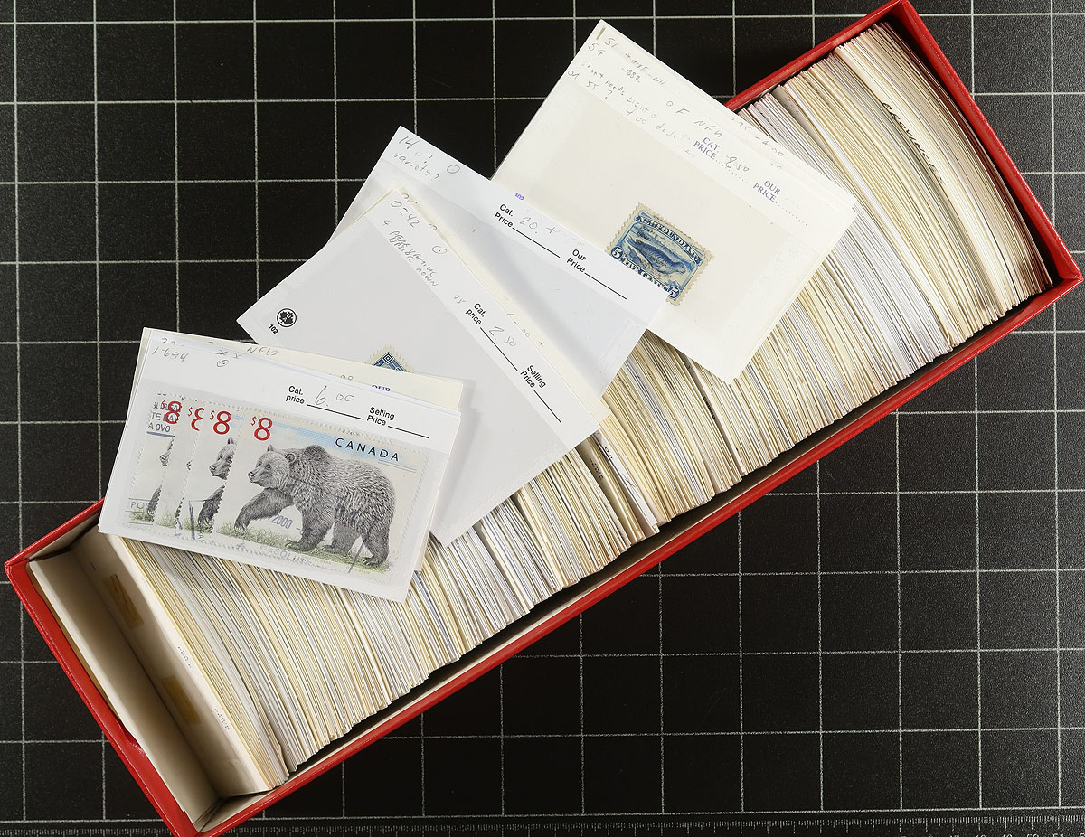 Lot of mint and used Canada in roughly 700x 102 dealer cards, containing roughly 1,000 stamps, including singles, sets, coils, and a few booklet panes. The material generally ranges from 1859 to 2004, covering Scott #14/2034, including back of the book issues, Newfoundland, and a few revenues. Most of the mint material is from the 1950s onward, but did see a few earlier mint issues, along with a few used Small Queens, Jubilees, 50c Edward, and more. Each card has been identified and priced using older catalogue values with a few ranging $5 to $15 and up. A nice lot which could contain a few surprises. Estimate =