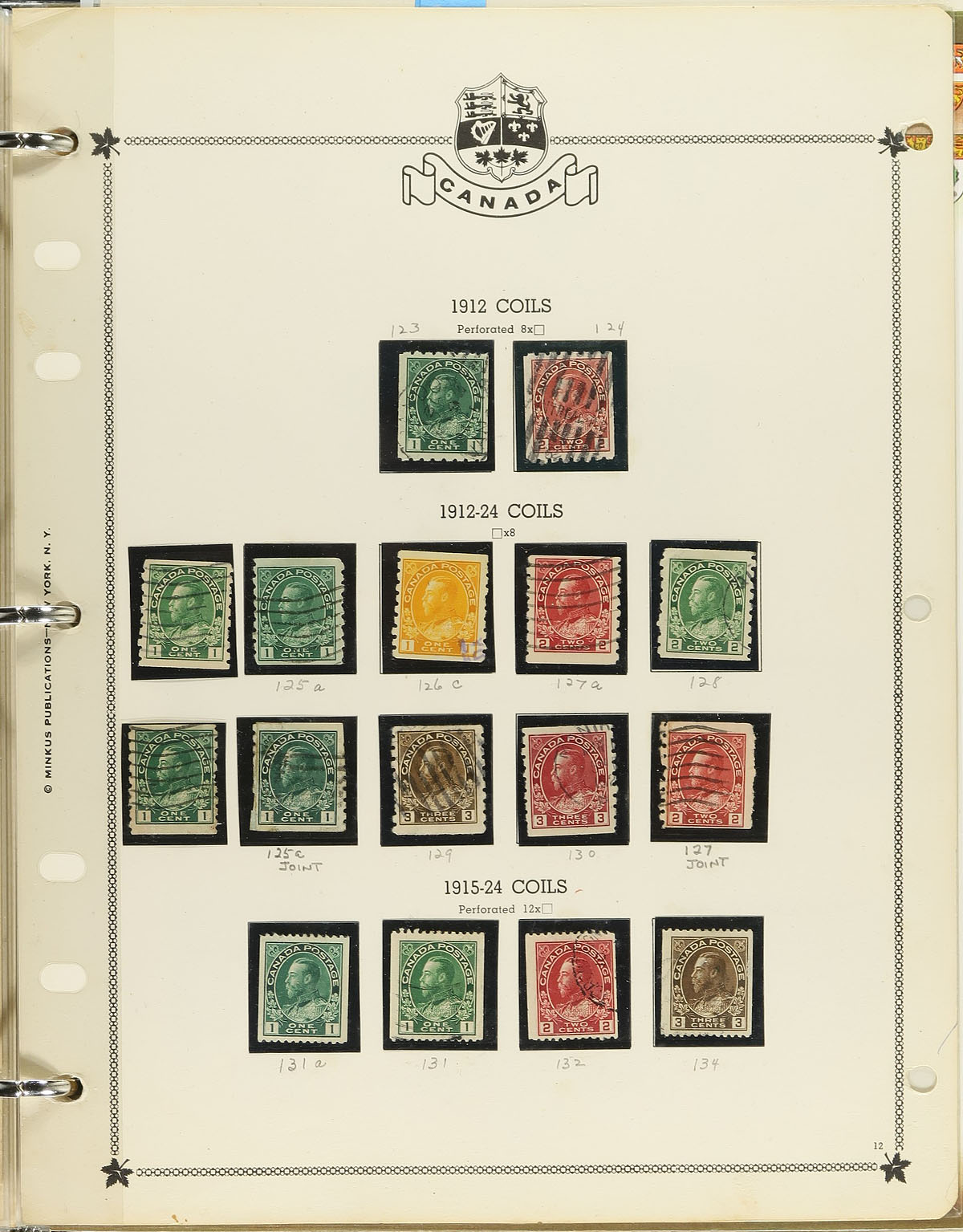Desirable collection of used Canada, 1870's-1969, containing many hundreds of stamps some in hingeless mounts on several album or homemade pages. There is a lot to digest here beginning with roughly 20 Small Queens (including 50c Widow Weeds), complete sets of Leafs, Numerals, Quebecs (Scott c.v. $708), Admirals (noting an attempt to include various shades), Admiral coil singles and pairs including Scott #s 123-124 (x2, $260 total), 136-138 pairs ($175 total), Scrolls (noting 50c Bluenose and $1 Parliament with dated cds postmarks), Arch, Pictorials, Airmails, Postage Dues, and more. The collection also includes additional pages of owner's duplicates of complete or part sets of Leafs onwards (noting another 50c Bluenose, $1 Parliament, coil issues, and more). Postmark interest includes cds, split ring, squared circles, RPO, MOOD, and more, noting many stamps having lovely "socked on the nose town" cancels. A potentially high cataloguing lot that should be popular with collectors, with sample photos provided. Estimate =