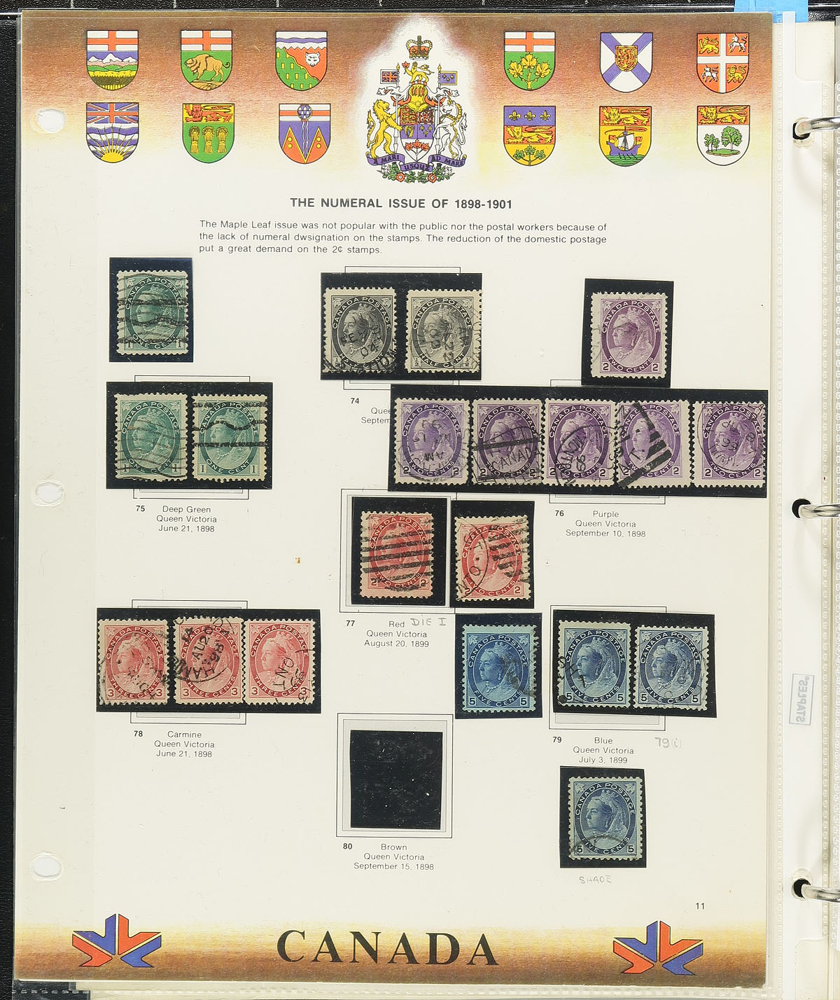 Desirable collection of used Canada, 1870's-1969, containing many hundreds of stamps some in hingeless mounts on several album or homemade pages. There is a lot to digest here beginning with roughly 20 Small Queens (including 50c Widow Weeds), complete sets of Leafs, Numerals, Quebecs (Scott c.v. $708), Admirals (noting an attempt to include various shades), Admiral coil singles and pairs including Scott #s 123-124 (x2, $260 total), 136-138 pairs ($175 total), Scrolls (noting 50c Bluenose and $1 Parliament with dated cds postmarks), Arch, Pictorials, Airmails, Postage Dues, and more. The collection also includes additional pages of owner's duplicates of complete or part sets of Leafs onwards (noting another 50c Bluenose, $1 Parliament, coil issues, and more). Postmark interest includes cds, split ring, squared circles, RPO, MOOD, and more, noting many stamps having lovely "socked on the nose town" cancels. A potentially high cataloguing lot that should be popular with collectors, with sample photos provided. Estimate =