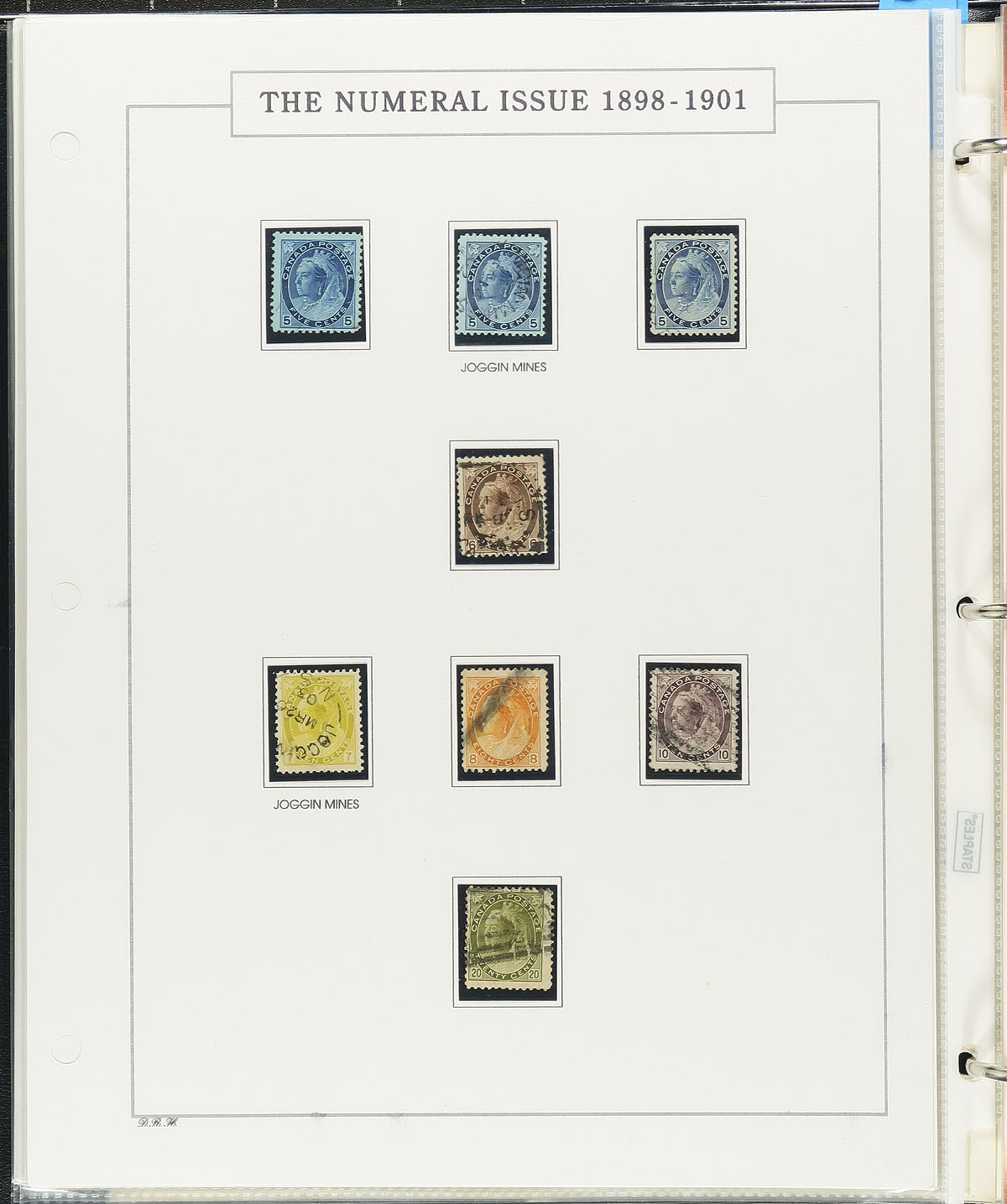 Desirable collection of used Canada, 1870's-1969, containing many hundreds of stamps some in hingeless mounts on several album or homemade pages. There is a lot to digest here beginning with roughly 20 Small Queens (including 50c Widow Weeds), complete sets of Leafs, Numerals, Quebecs (Scott c.v. $708), Admirals (noting an attempt to include various shades), Admiral coil singles and pairs including Scott #s 123-124 (x2, $260 total), 136-138 pairs ($175 total), Scrolls (noting 50c Bluenose and $1 Parliament with dated cds postmarks), Arch, Pictorials, Airmails, Postage Dues, and more. The collection also includes additional pages of owner's duplicates of complete or part sets of Leafs onwards (noting another 50c Bluenose, $1 Parliament, coil issues, and more). Postmark interest includes cds, split ring, squared circles, RPO, MOOD, and more, noting many stamps having lovely "socked on the nose town" cancels. A potentially high cataloguing lot that should be popular with collectors, with sample photos provided. Estimate =