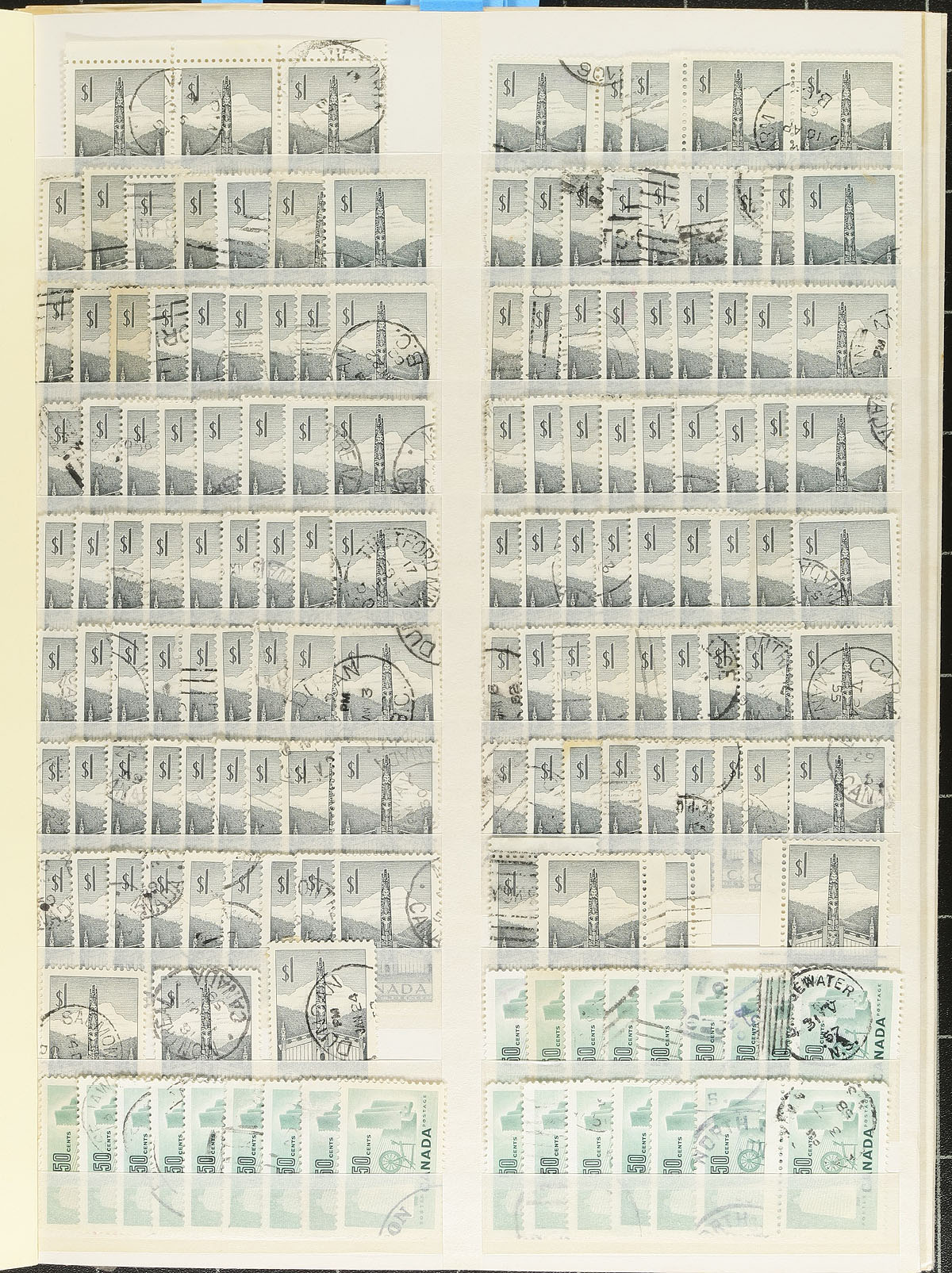 Consignment remainders of used Canada, containing tens of thousands of stamps, including a 32 page high value stockbook containing thousands of higher denomination stamps from the 1950's to the 1990's, close cut on paper stamps (27oz bag mostly definitives from the 1970s-1990's), and over 100 bundles of 100 stamps each. Postmark interest includes CDS, MOON, and surely other types. A nice lot for the postmark hunter. Estimate =