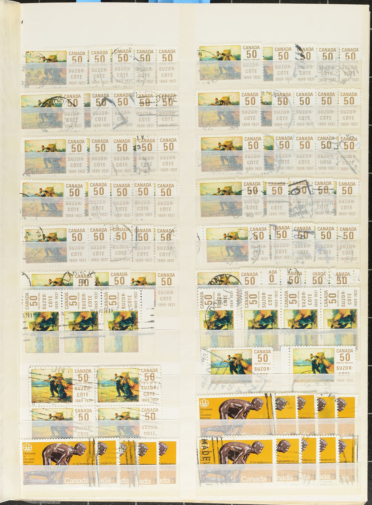 Consignment remainders of used Canada, containing tens of thousands of stamps, including a 32 page high value stockbook containing thousands of higher denomination stamps from the 1950's to the 1990's, close cut on paper stamps (27oz bag mostly definitives from the 1970s-1990's), and over 100 bundles of 100 stamps each. Postmark interest includes CDS, MOON, and surely other types. A nice lot for the postmark hunter. Estimate =