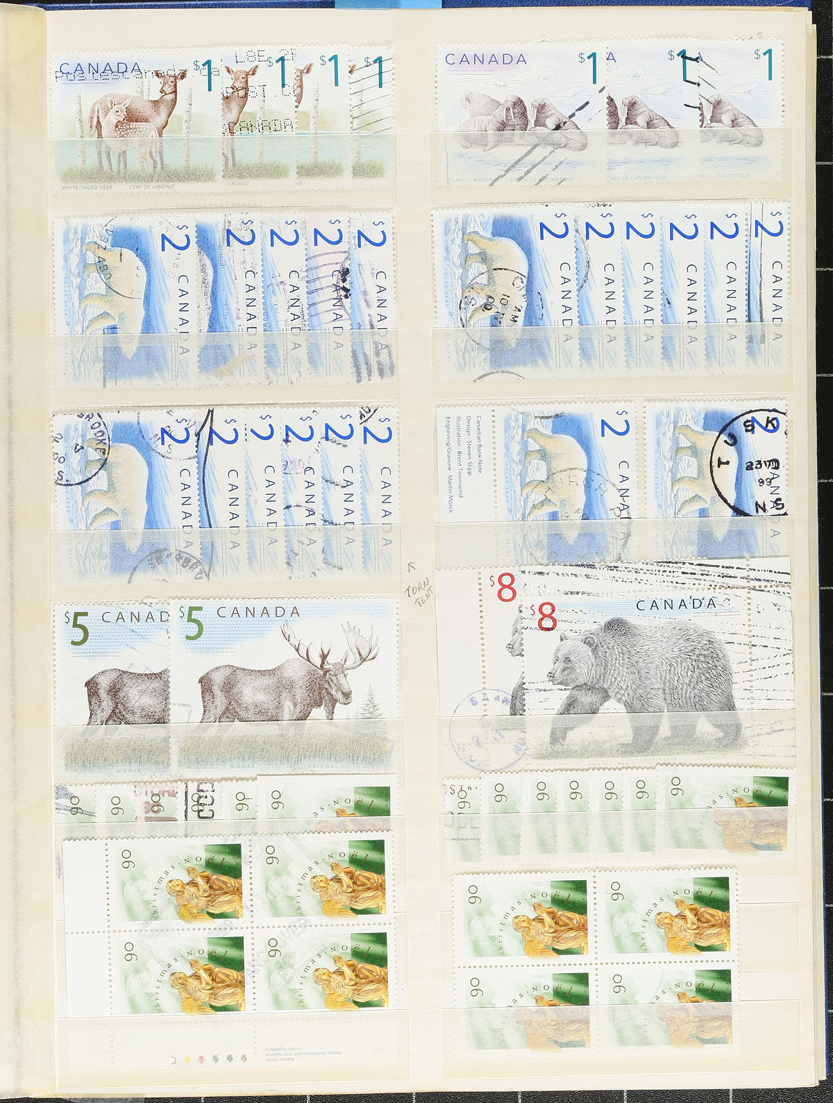 Consignment remainders of used Canada, containing tens of thousands of stamps, including a 32 page high value stockbook containing thousands of higher denomination stamps from the 1950's to the 1990's, close cut on paper stamps (27oz bag mostly definitives from the 1970s-1990's), and over 100 bundles of 100 stamps each. Postmark interest includes CDS, MOON, and surely other types. A nice lot for the postmark hunter. Estimate =