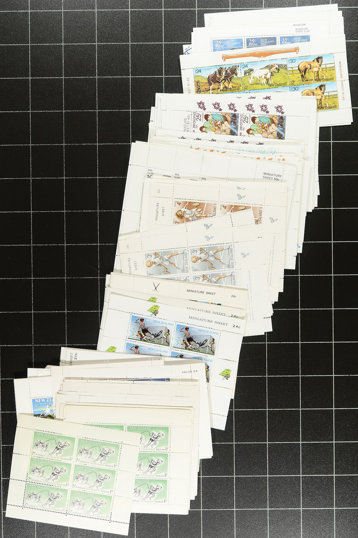 Lovely accumulation of mint New Zealand Health miniature sheets, 1957-1989, with 46 different issues ranging from Scott #B52a/B136a. A spot check indicated a mixture of lightly hinged and never hinged sheets, with many cataloguing in the $5 to $15 range each. Duplication ranges from 2 to 5 and up for most issues. A nice lot for collectors, dealers, and online resellers. 2026 Scott US$1,254.00 =