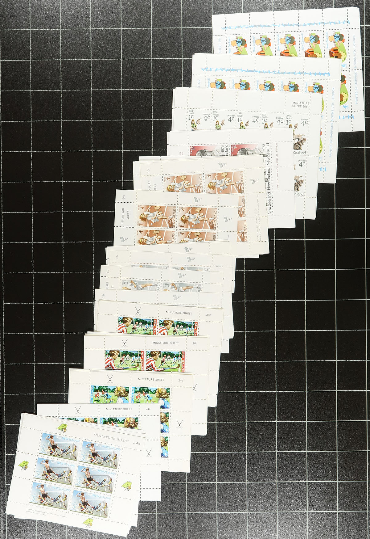 Lovely accumulation of mint New Zealand Health miniature sheets, 1957-1989, with 46 different issues ranging from Scott #B52a/B136a. A spot check indicated a mixture of lightly hinged and never hinged sheets, with many cataloguing in the $5 to $15 range each. Duplication ranges from 2 to 5 and up for most issues. A nice lot for collectors, dealers, and online resellers. 2026 Scott US$1,254.00 =