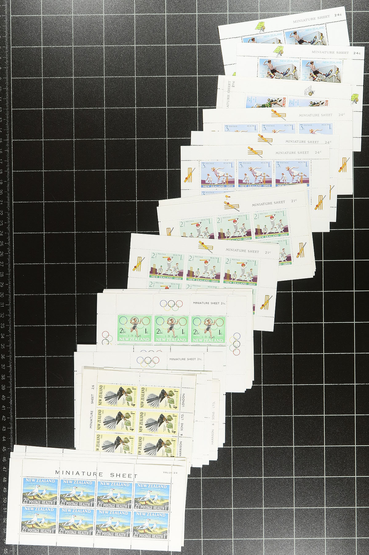 Lovely accumulation of mint New Zealand Health miniature sheets, 1957-1989, with 46 different issues ranging from Scott #B52a/B136a. A spot check indicated a mixture of lightly hinged and never hinged sheets, with many cataloguing in the $5 to $15 range each. Duplication ranges from 2 to 5 and up for most issues. A nice lot for collectors, dealers, and online resellers. 2026 Scott US$1,254.00 =