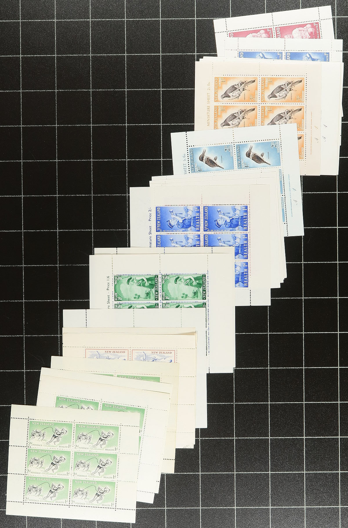 Lovely accumulation of mint New Zealand Health miniature sheets, 1957-1989, with 46 different issues ranging from Scott #B52a/B136a. A spot check indicated a mixture of lightly hinged and never hinged sheets, with many cataloguing in the $5 to $15 range each. Duplication ranges from 2 to 5 and up for most issues. A nice lot for collectors, dealers, and online resellers. 2026 Scott US$1,254.00 =