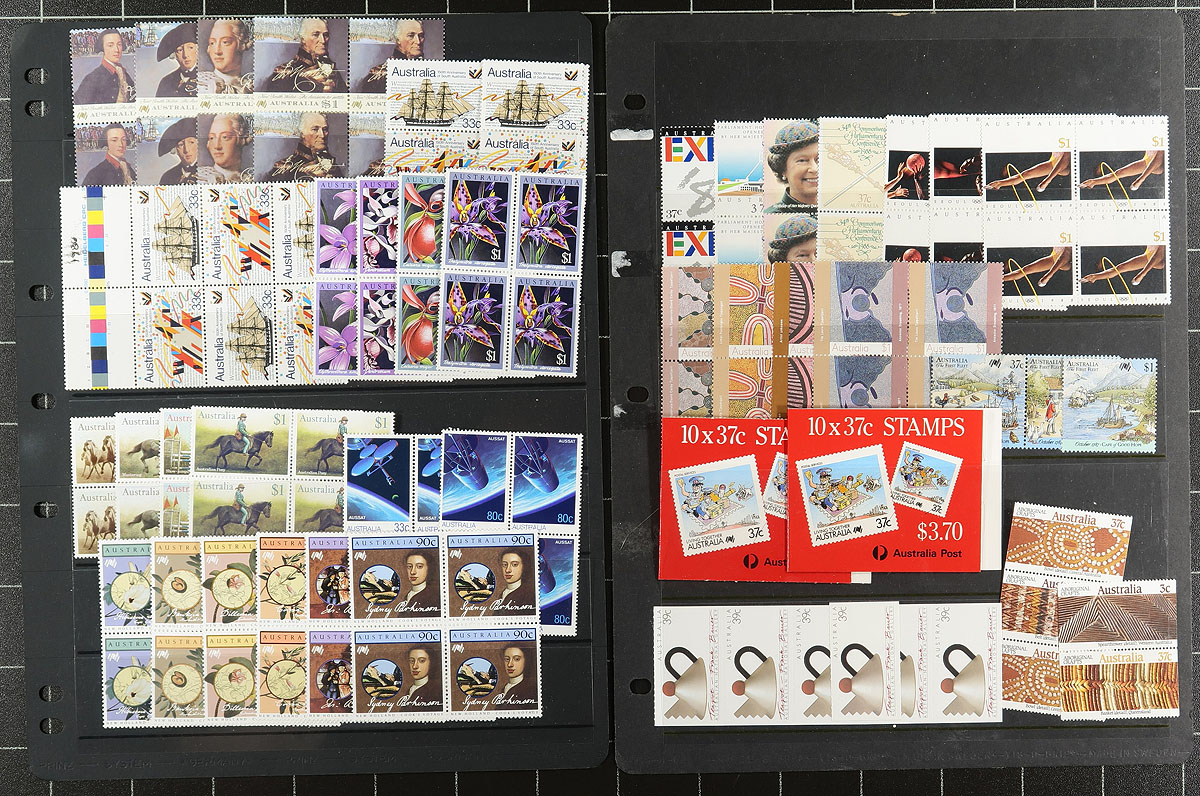 Collection of never hinged Austalia, 1972-1994, containing many hundreds of stamps in a variety of formats. This collection has a bit of everything, with most issues collected in blocks of four, along with several booklets, sheets and special issues, presentation packs, with some high value definitives. A spot check of material indicated some stamps cataloguing $5 to $10 and up, with most likely several hundreds of dollars of face value postage. An ideal lot for the Australia collector or postage user, overall very fine. Estimate =