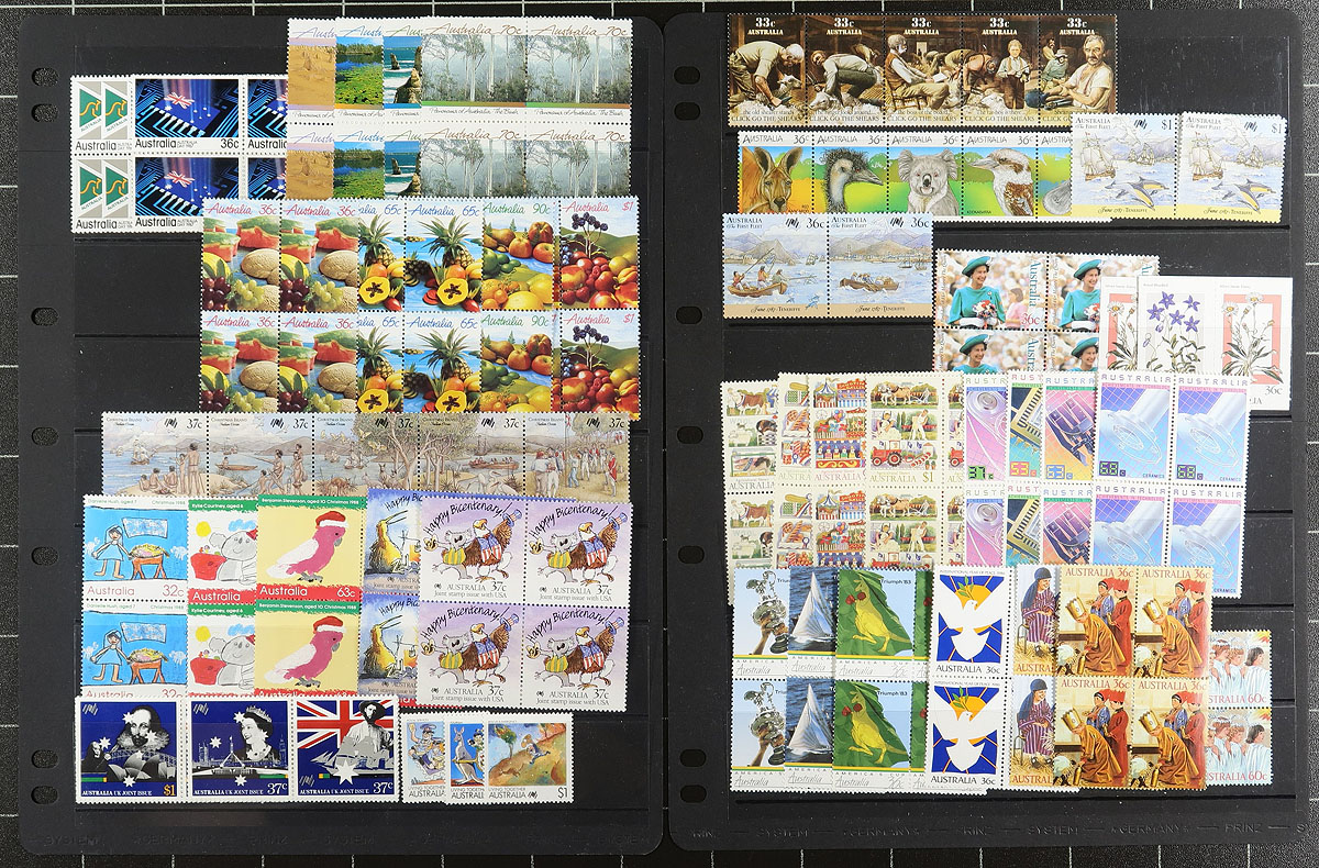 Collection of never hinged Austalia, 1972-1994, containing many hundreds of stamps in a variety of formats. This collection has a bit of everything, with most issues collected in blocks of four, along with several booklets, sheets and special issues, presentation packs, with some high value definitives. A spot check of material indicated some stamps cataloguing $5 to $10 and up, with most likely several hundreds of dollars of face value postage. An ideal lot for the Australia collector or postage user, overall very fine. Estimate =