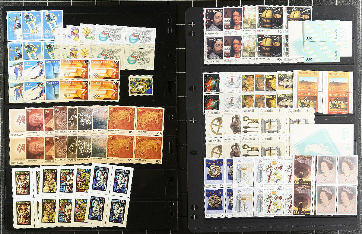 Collection of never hinged Austalia, 1972-1994, containing many hundreds of stamps in a variety of formats. This collection has a bit of everything, with most issues collected in blocks of four, along with several booklets, sheets and special issues, presentation packs, with some high value definitives. A spot check of material indicated some stamps cataloguing $5 to $10 and up, with most likely several hundreds of dollars of face value postage. An ideal lot for the Australia collector or postage user, overall very fine. Estimate =