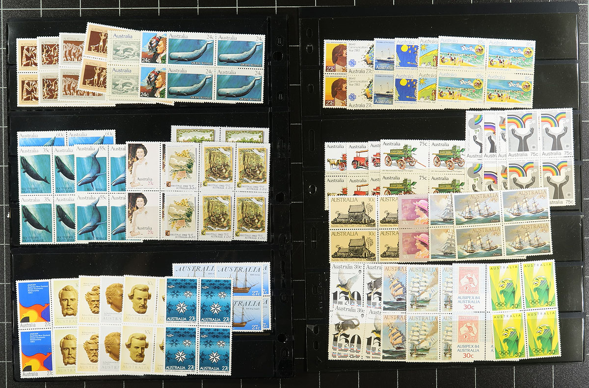 Collection of never hinged Austalia, 1972-1994, containing many hundreds of stamps in a variety of formats. This collection has a bit of everything, with most issues collected in blocks of four, along with several booklets, sheets and special issues, presentation packs, with some high value definitives. A spot check of material indicated some stamps cataloguing $5 to $10 and up, with most likely several hundreds of dollars of face value postage. An ideal lot for the Australia collector or postage user, overall very fine. Estimate =