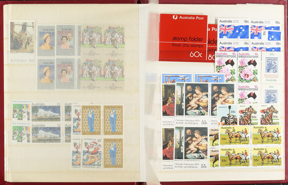 Collection of never hinged Austalia, 1972-1994, containing many hundreds of stamps in a variety of formats. This collection has a bit of everything, with most issues collected in blocks of four, along with several booklets, sheets and special issues, presentation packs, with some high value definitives. A spot check of material indicated some stamps cataloguing $5 to $10 and up, with most likely several hundreds of dollars of face value postage. An ideal lot for the Australia collector or postage user, overall very fine. Estimate =