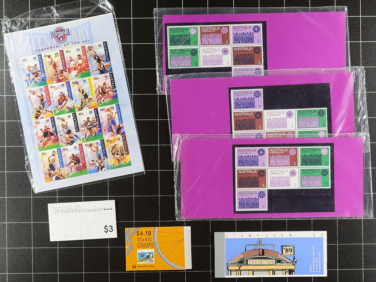 Collection of never hinged Austalia, 1972-1994, containing many hundreds of stamps in a variety of formats. This collection has a bit of everything, with most issues collected in blocks of four, along with several booklets, sheets and special issues, presentation packs, with some high value definitives. A spot check of material indicated some stamps cataloguing $5 to $10 and up, with most likely several hundreds of dollars of face value postage. An ideal lot for the Australia collector or postage user, overall very fine. Estimate =