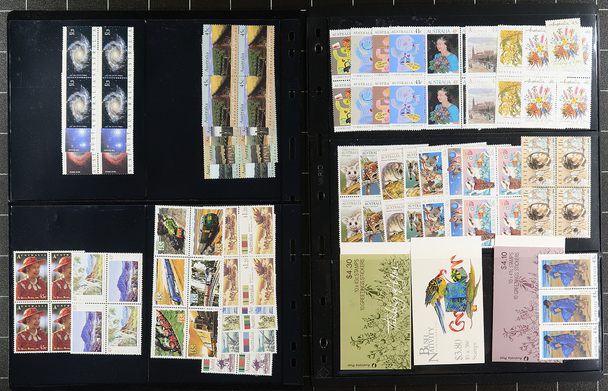 Collection of never hinged Austalia, 1972-1994, containing many hundreds of stamps in a variety of formats. This collection has a bit of everything, with most issues collected in blocks of four, along with several booklets, sheets and special issues, presentation packs, with some high value definitives. A spot check of material indicated some stamps cataloguing $5 to $10 and up, with most likely several hundreds of dollars of face value postage. An ideal lot for the Australia collector or postage user, overall very fine. Estimate =