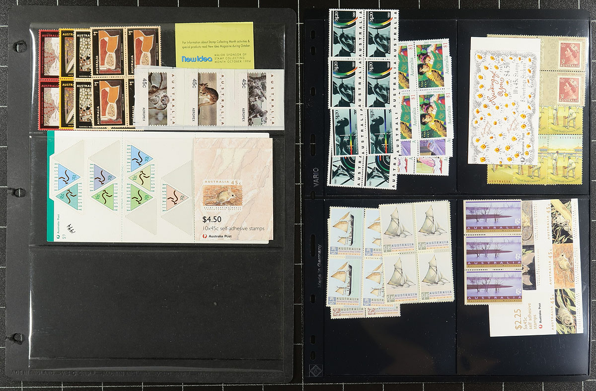 Collection of never hinged Austalia, 1972-1994, containing many hundreds of stamps in a variety of formats. This collection has a bit of everything, with most issues collected in blocks of four, along with several booklets, sheets and special issues, presentation packs, with some high value definitives. A spot check of material indicated some stamps cataloguing $5 to $10 and up, with most likely several hundreds of dollars of face value postage. An ideal lot for the Australia collector or postage user, overall very fine. Estimate =