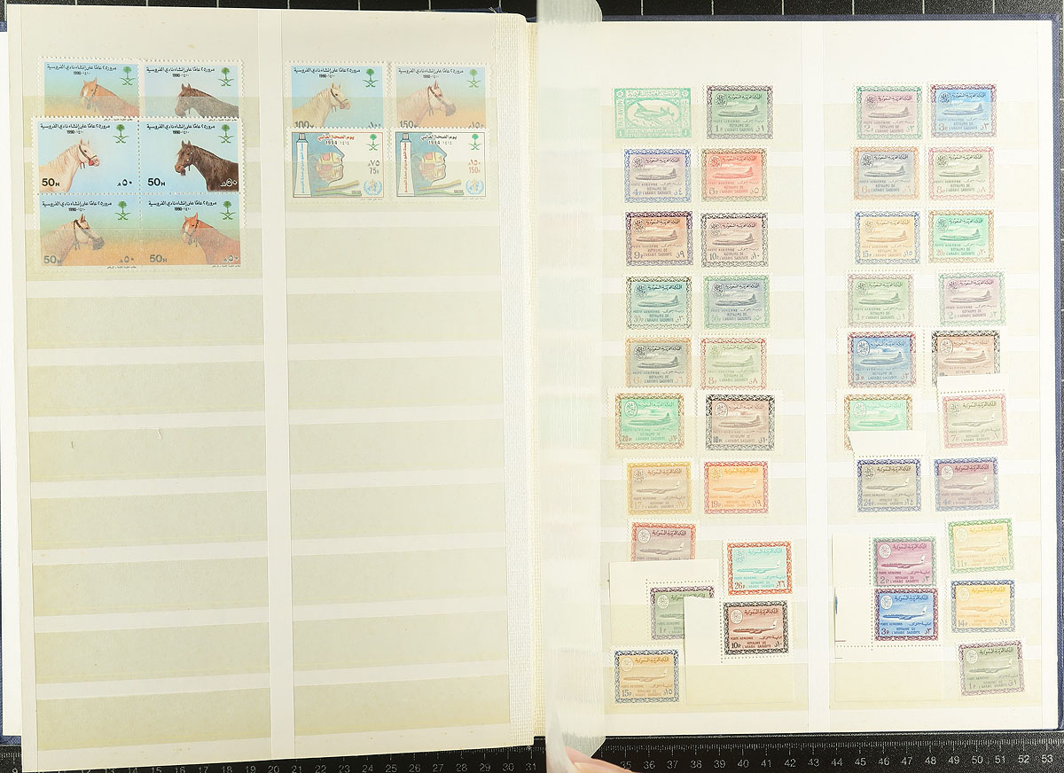 Lovely mint collection of Saudi Arabia, 1917-1994, containing roughly 350 stamps in a stockbook. The collection ranges from Scott #s L10/1186, containing singles and primarily sets including a good selection of airmail issues, with better representation from the 1930s to the 1970's. Just a few of the better items include L13 pair (mh, $65 total), 674 souvenir sheet (nh, $400), along with many singles and sets cataloguing $15-$25 and up each. A spot check indicated a mixture of mint hinged and never hinged material with all pages photographed online, ideal for collectors and dealers looking for stock. 2026 Scott US$2,402.00 =