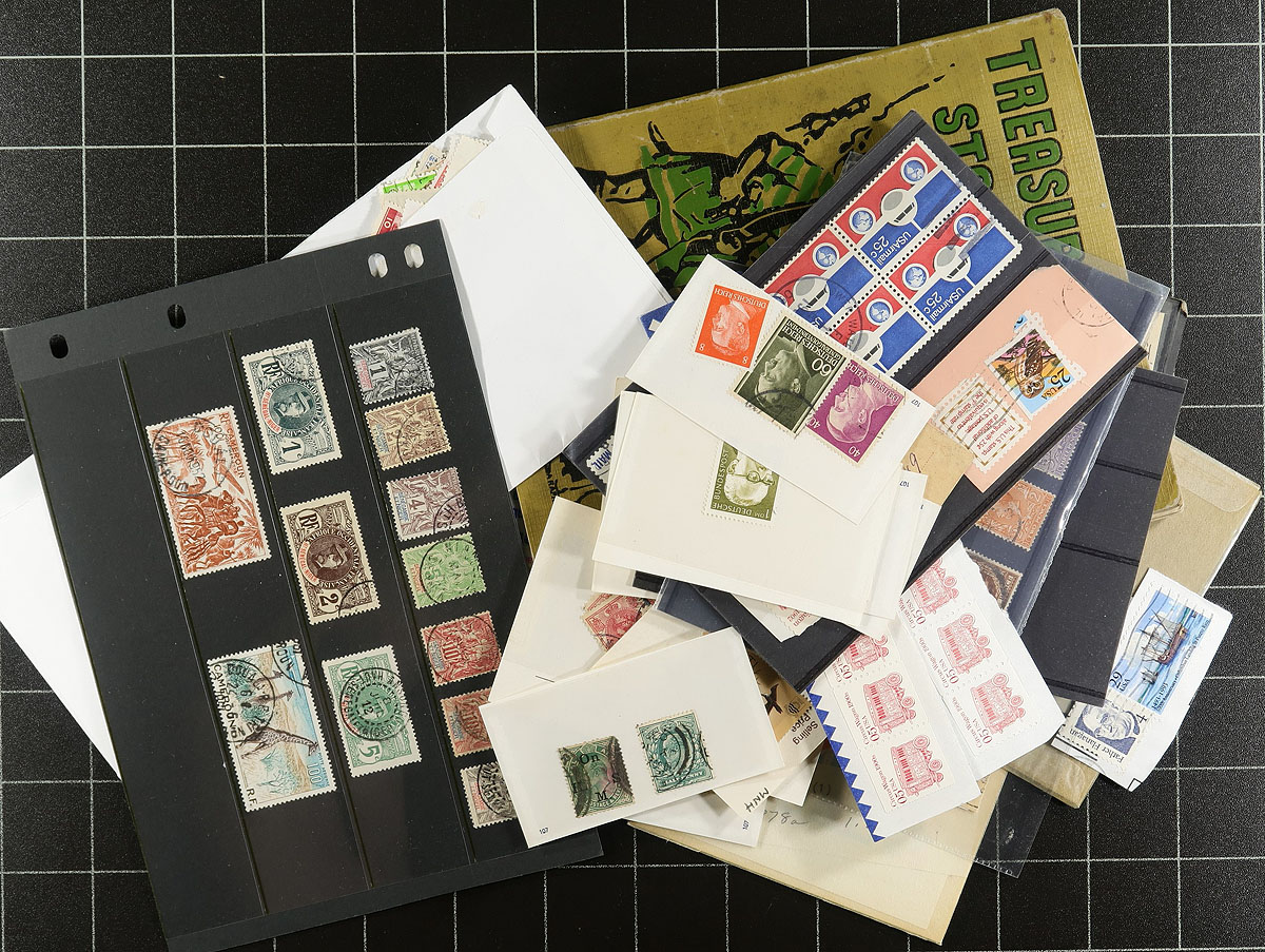 Mystery carton chalk full of thousands worldwide stamps in a variety of formats, in glassines, stock cards, album pages, stockbook, and more. A very cursory check noted material from the 1900's to the 1970's, but probable material on either side of the range. A fun project for the worldwide collector. Estimate =