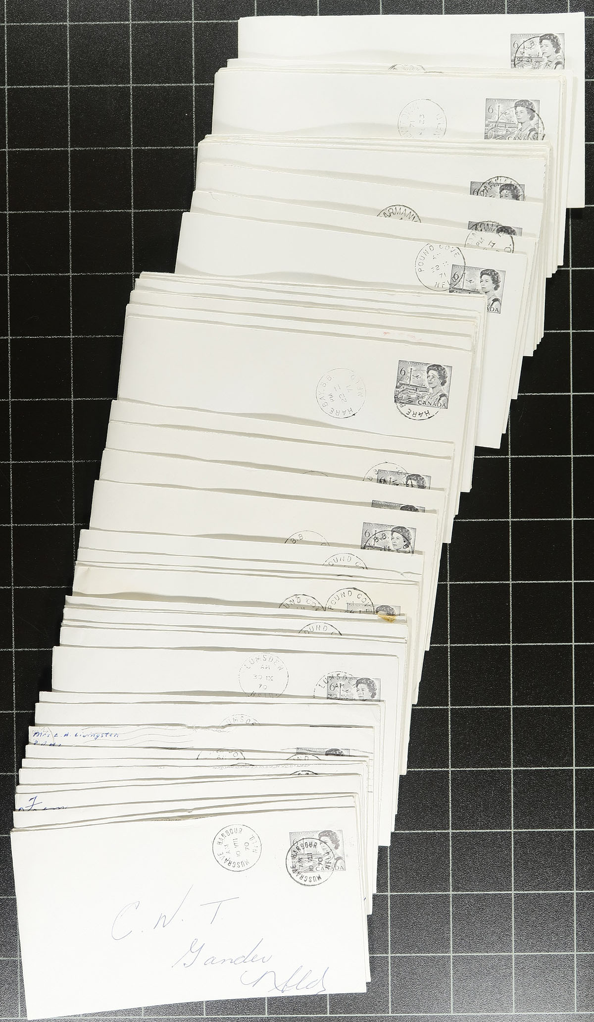 Newfoundland Postmarks. Group of roughly 350 covers collected for Newfoundland town postmarks, 1960s-1971. We note towns ranging from A to W, roughly 50 different towns represented including Change Islands, Rodgers Cove, Pools Island, Open Hall, Fortune, Glovertown, and much more, noting split ring, duplex, cds, machine, and other town cancel types. All the mail is commercial in nature, a few with corner advertising, paying 6c or 7c rates. Duplication is generally up to 5 for some towns, but might have different frankings or postmark types. A few faults as is the nature of commercial mail, still a nice lot for the postmark collector. Estimate =