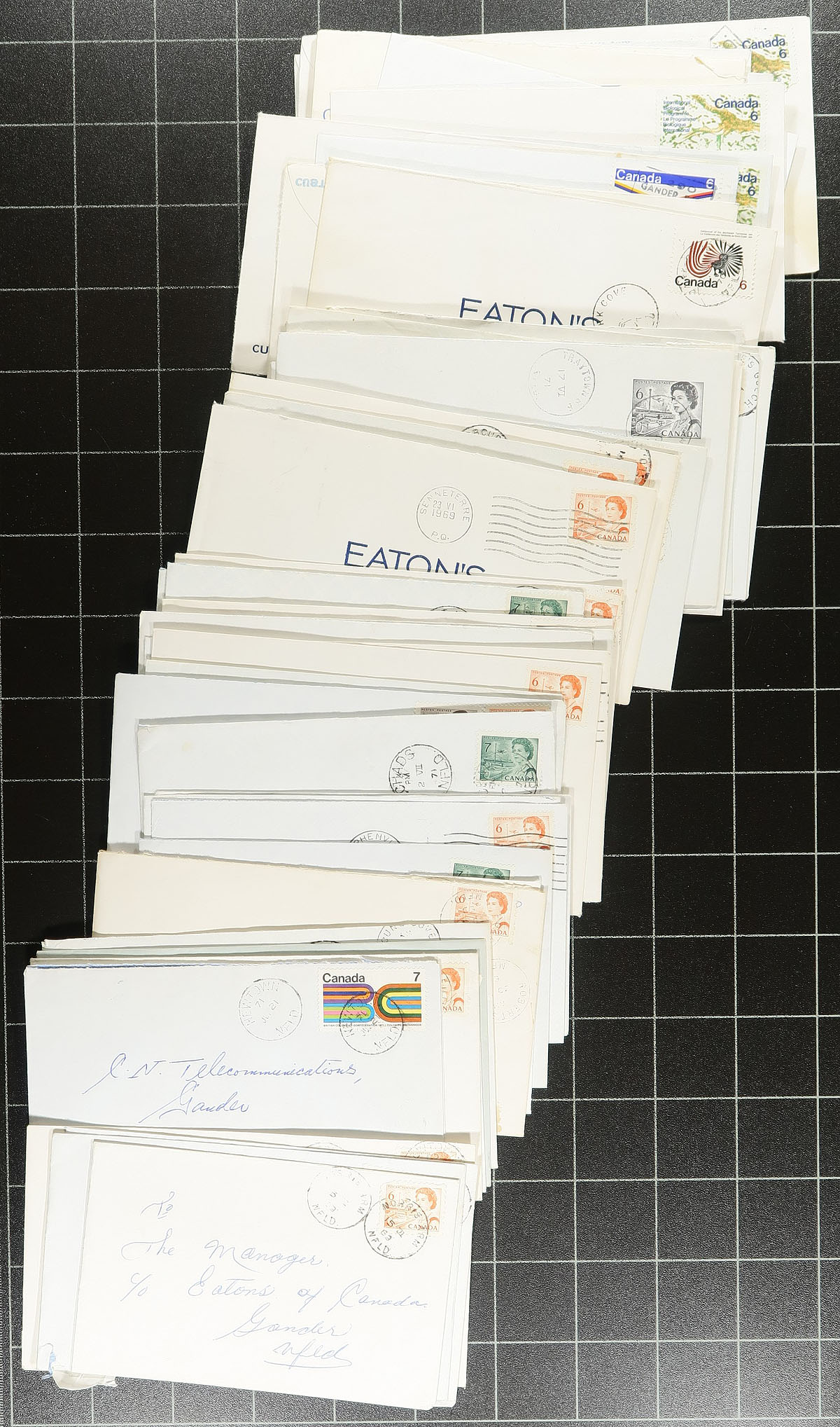 Newfoundland Postmarks. Group of roughly 350 covers collected for Newfoundland town postmarks, 1960s-1971. We note towns ranging from A to W, roughly 50 different towns represented including Change Islands, Rodgers Cove, Pools Island, Open Hall, Fortune, Glovertown, and much more, noting split ring, duplex, cds, machine, and other town cancel types. All the mail is commercial in nature, a few with corner advertising, paying 6c or 7c rates. Duplication is generally up to 5 for some towns, but might have different frankings or postmark types. A few faults as is the nature of commercial mail, still a nice lot for the postmark collector. Estimate =