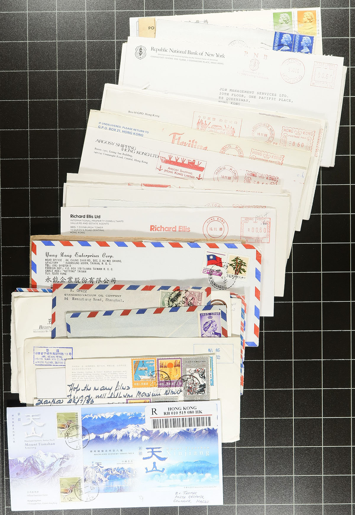 Group of roughly 250 Asia covers, generally ranging from the 1960's to the 1990's, noting a variety of material. We note better representation from China (including PRC), Japan, and Hong Kong, along with Korea and Nepal, including post cards, parcels, first day covers, commercial mail, meter mail, and more. A few faults with a few of the covers, as is the nature of commercial mail, still a nice lot for the postal history collector. Estimate =