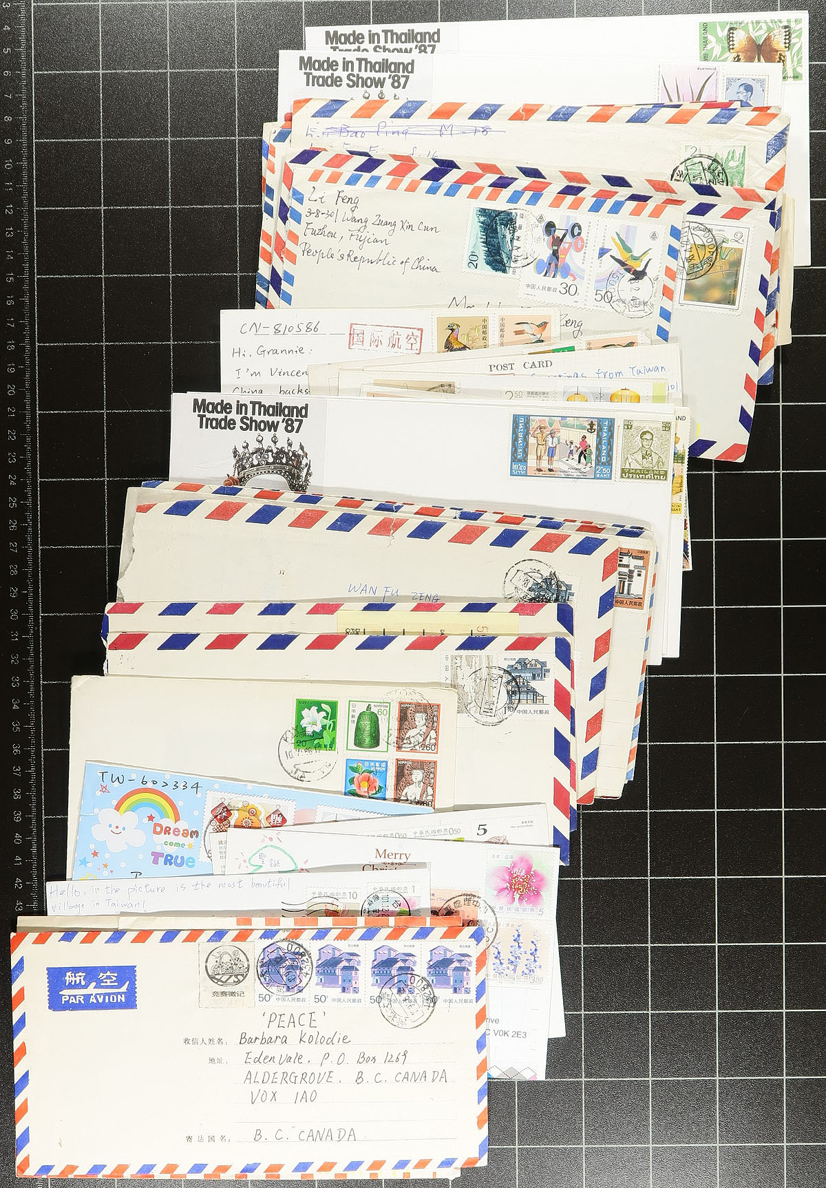 Group of roughly 250 Asia covers, generally ranging from the 1960's to the 1990's, noting a variety of material. We note better representation from China (including PRC), Japan, and Hong Kong, along with Korea and Nepal, including post cards, parcels, first day covers, commercial mail, meter mail, and more. A few faults with a few of the covers, as is the nature of commercial mail, still a nice lot for the postal history collector. Estimate =