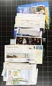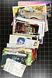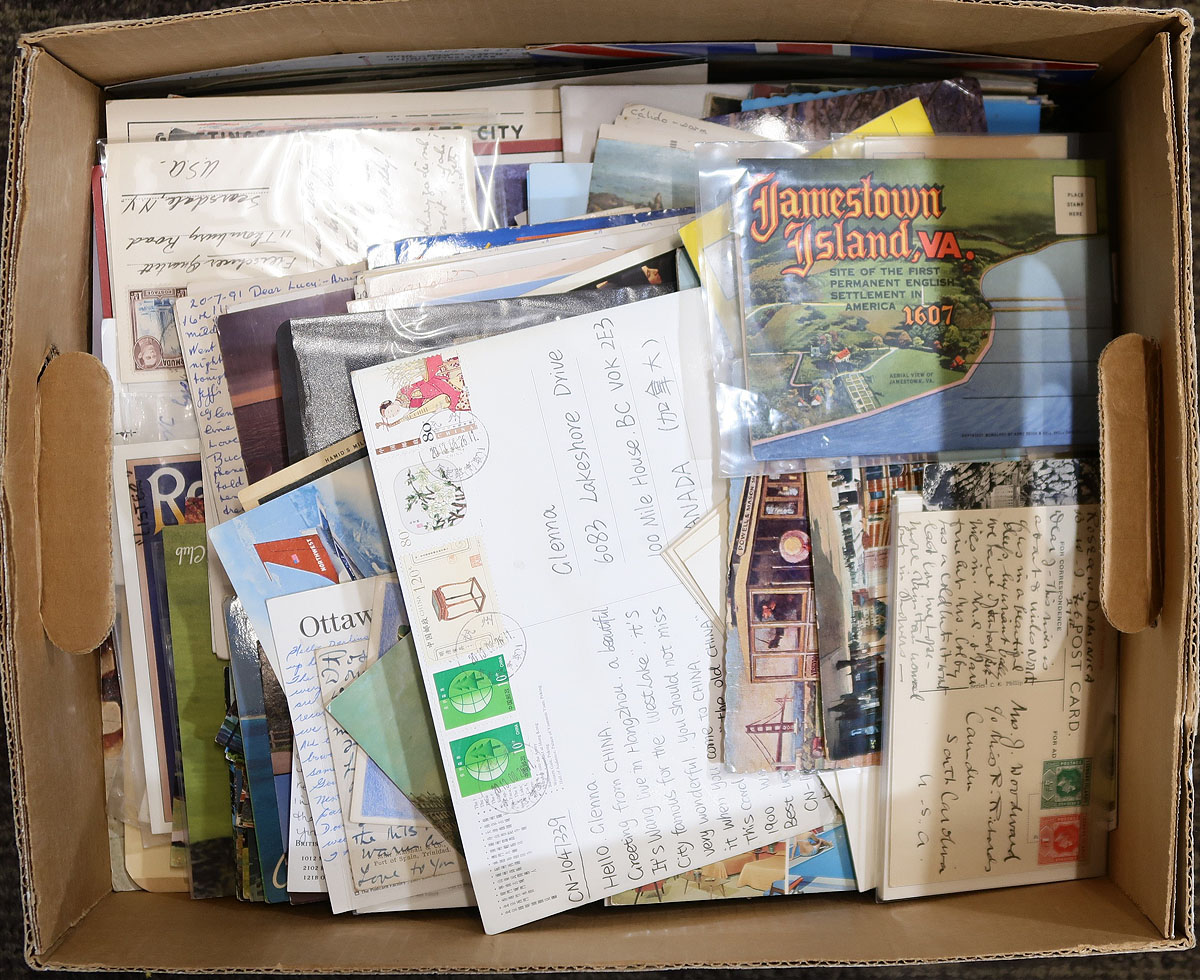 Accumulation of roughly 1,000 worldwide postcards in a bankers box, containing several classic era cards, real photo cards, sepia, right up to modern chromes. Better representation from Canada, Europe, along with United State and West Indies to name a few, encountering many subjects including military, street scenes, nature, vacation scenery, buildings, and much more. A few faults with a few of the cards, overall fine to very fine. Estimate =