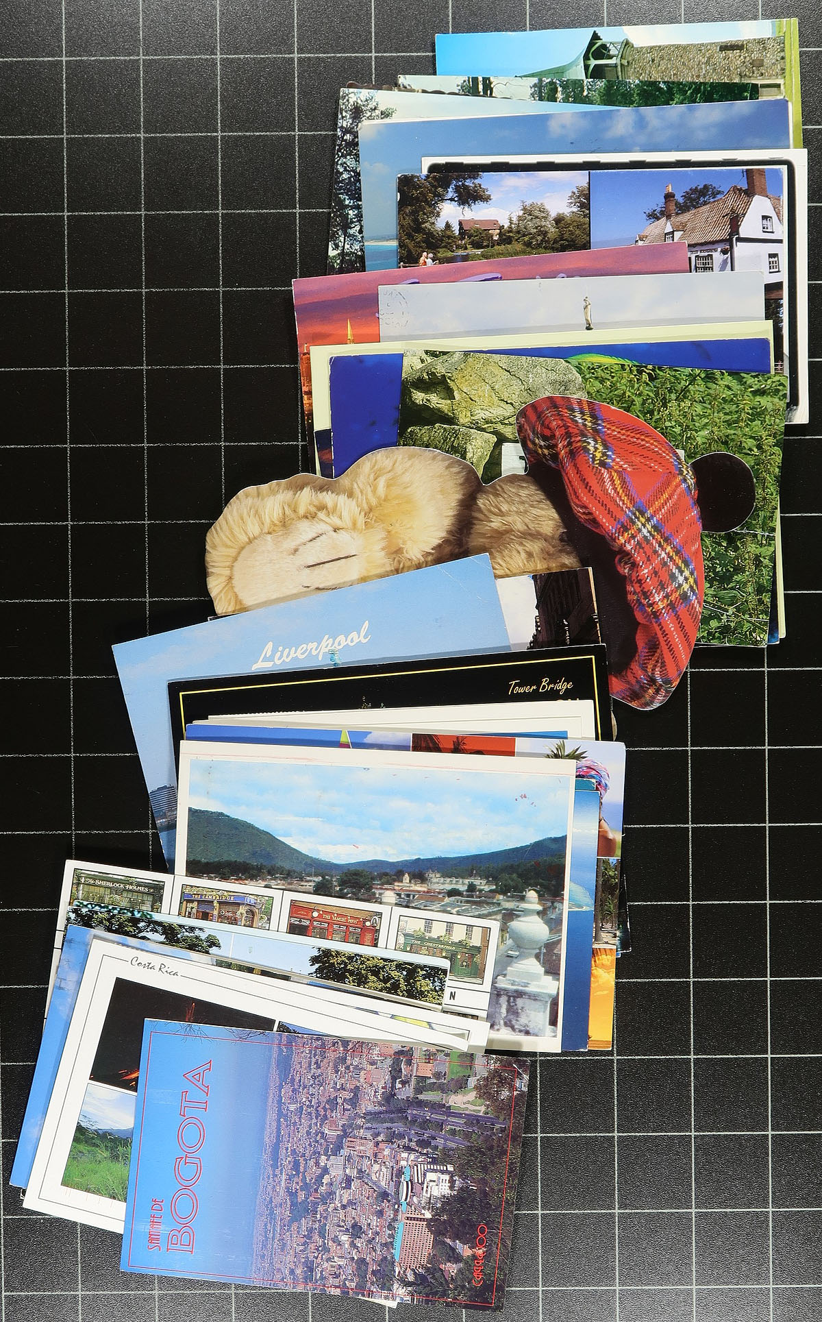 Accumulation of roughly 1,000 worldwide postcards in a bankers box, containing several classic era cards, real photo cards, sepia, right up to modern chromes. Better representation from Canada, Europe, along with United State and West Indies to name a few, encountering many subjects including military, street scenes, nature, vacation scenery, buildings, and much more. A few faults with a few of the cards, overall fine to very fine. Estimate =