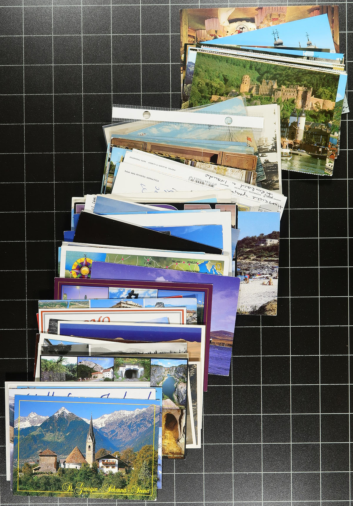 Accumulation of roughly 1,000 worldwide postcards in a bankers box, containing several classic era cards, real photo cards, sepia, right up to modern chromes. Better representation from Canada, Europe, along with United State and West Indies to name a few, encountering many subjects including military, street scenes, nature, vacation scenery, buildings, and much more. A few faults with a few of the cards, overall fine to very fine. Estimate =