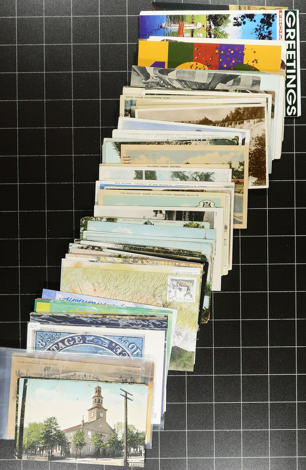 Accumulation of roughly 1,000 worldwide postcards in a bankers box, containing several classic era cards, real photo cards, sepia, right up to modern chromes. Better representation from Canada, Europe, along with United State and West Indies to name a few, encountering many subjects including military, street scenes, nature, vacation scenery, buildings, and much more. A few faults with a few of the cards, overall fine to very fine. Estimate =