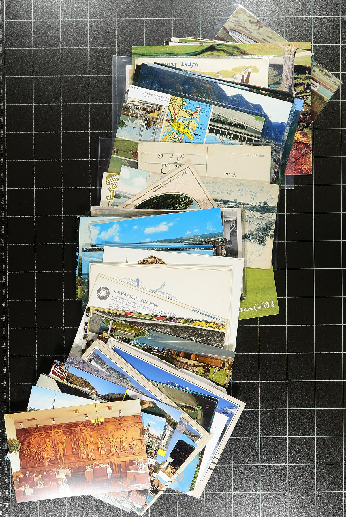 Accumulation of roughly 1,000 worldwide postcards in a bankers box, containing several classic era cards, real photo cards, sepia, right up to modern chromes. Better representation from Canada, Europe, along with United State and West Indies to name a few, encountering many subjects including military, street scenes, nature, vacation scenery, buildings, and much more. A few faults with a few of the cards, overall fine to very fine. Estimate =