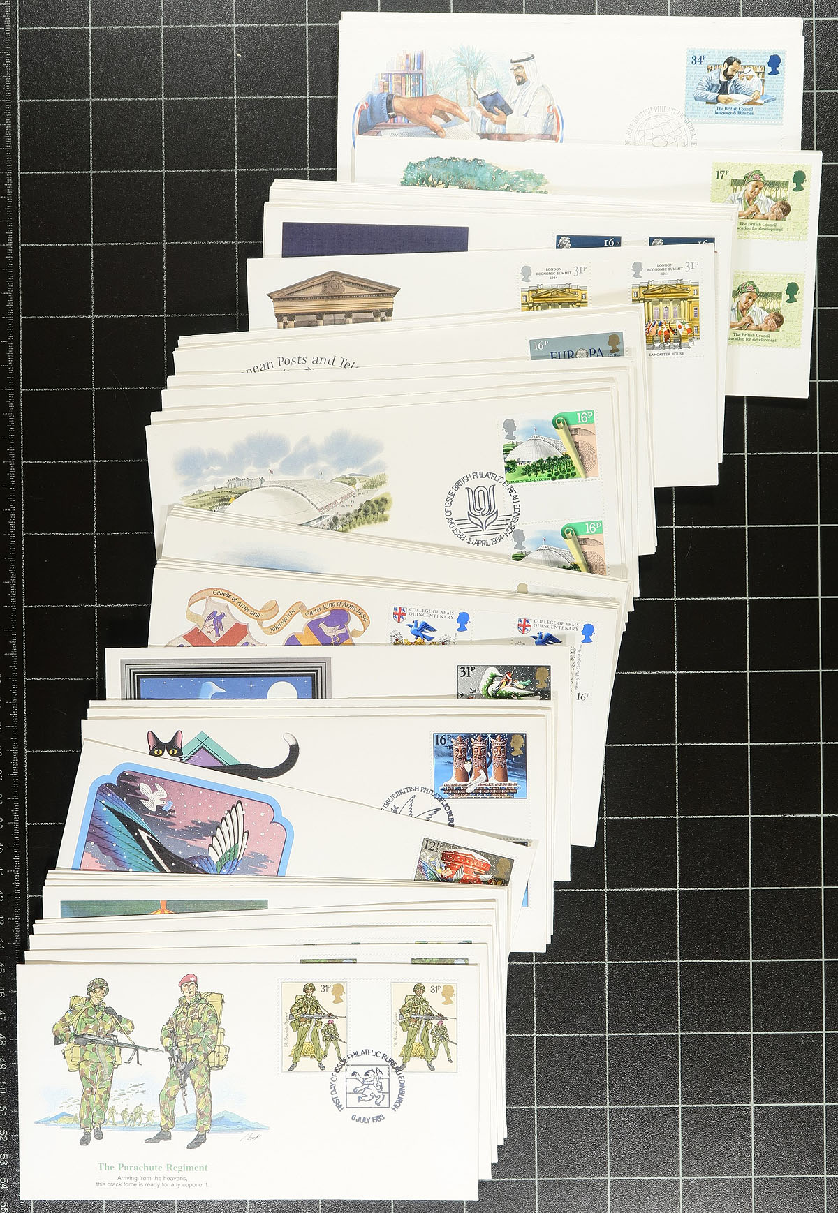 Collection of roughly 450 Great Britain first day covers, 1972-2005, noting singles, many sets, regionals, souvenir sheets and booklet pane frankings. We spotted a few signed covers from notable people. along with a few private cachets. A nice lot for collectors. Estimate =