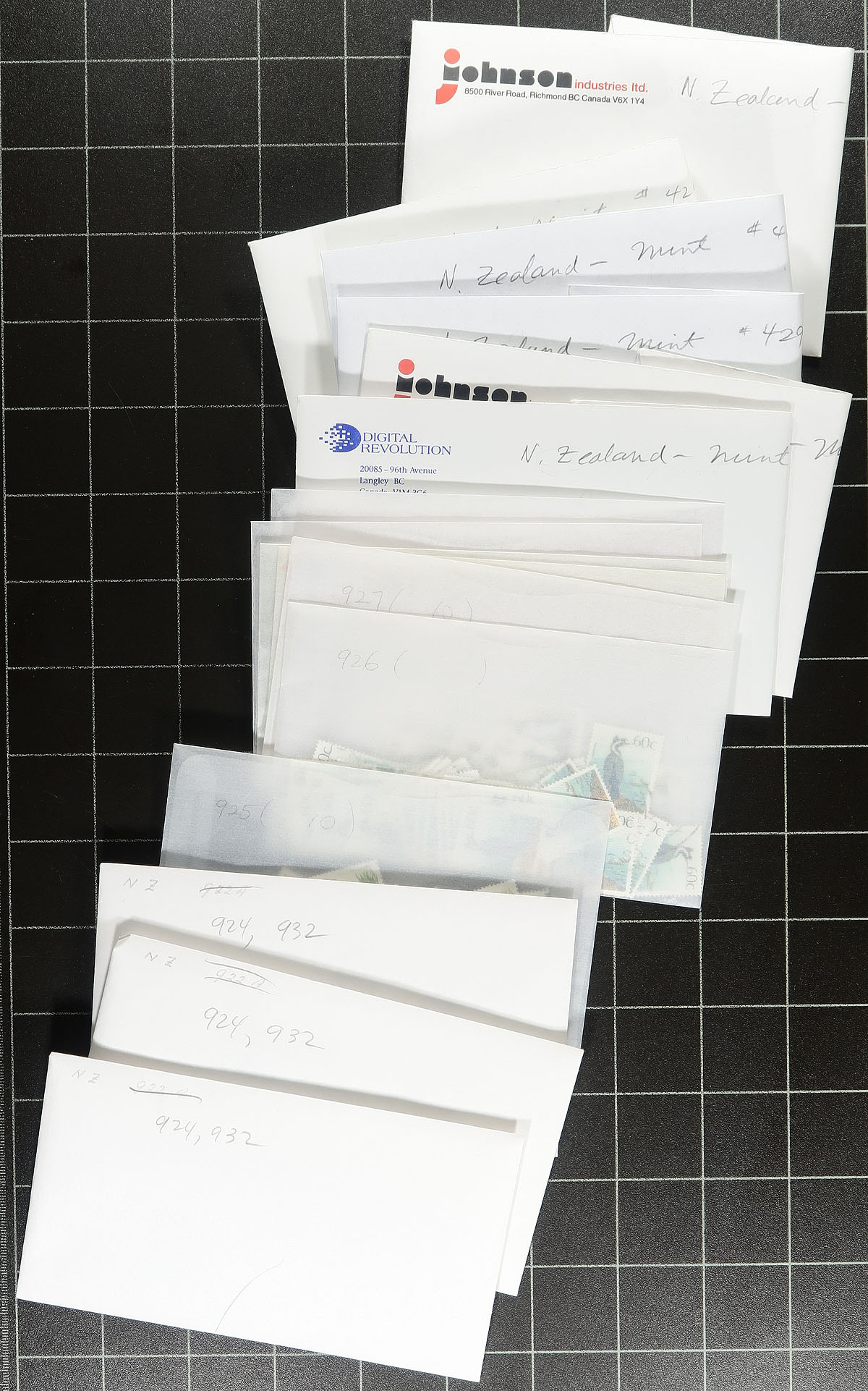 Shoebox with mint and (mostly) used issues. The mint might be from a collection that was taken out of its album and now resides in several #10 envelopes (we pulled out some better-looking items to give you a sense of what is there). Most is hinged, and condition is a bit mixed, but there is lots of catalogue value here. Comes with a couple of heavily duplicated mint issues not considered in our estimate. The used is mostly 40c era issues with at least a dozen stamps for each issue represented. Lots of birds, with some medium to higher values, such as 30 copies of the $10.00 Kiwi. Bonus is four #10 envelopes with "Private Courier" issues. Fills a shoebox. Lots of exploring here. Estimate =