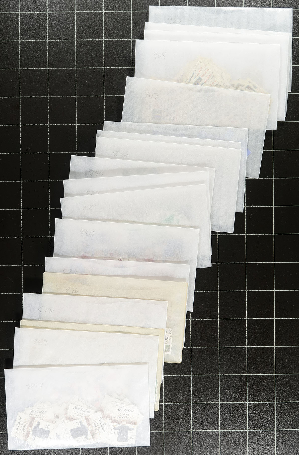 Shoebox with mint and (mostly) used issues. The mint might be from a collection that was taken out of its album and now resides in several #10 envelopes (we pulled out some better-looking items to give you a sense of what is there). Most is hinged, and condition is a bit mixed, but there is lots of catalogue value here. Comes with a couple of heavily duplicated mint issues not considered in our estimate. The used is mostly 40c era issues with at least a dozen stamps for each issue represented. Lots of birds, with some medium to higher values, such as 30 copies of the $10.00 Kiwi. Bonus is four #10 envelopes with "Private Courier" issues. Fills a shoebox. Lots of exploring here. Estimate =