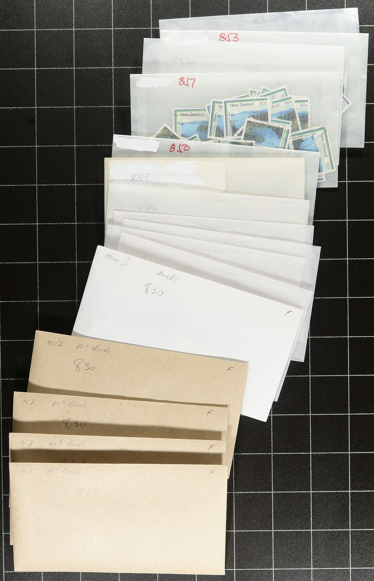 Shoebox with mint and (mostly) used issues. The mint might be from a collection that was taken out of its album and now resides in several #10 envelopes (we pulled out some better-looking items to give you a sense of what is there). Most is hinged, and condition is a bit mixed, but there is lots of catalogue value here. Comes with a couple of heavily duplicated mint issues not considered in our estimate. The used is mostly 40c era issues with at least a dozen stamps for each issue represented. Lots of birds, with some medium to higher values, such as 30 copies of the $10.00 Kiwi. Bonus is four #10 envelopes with "Private Courier" issues. Fills a shoebox. Lots of exploring here. Estimate =