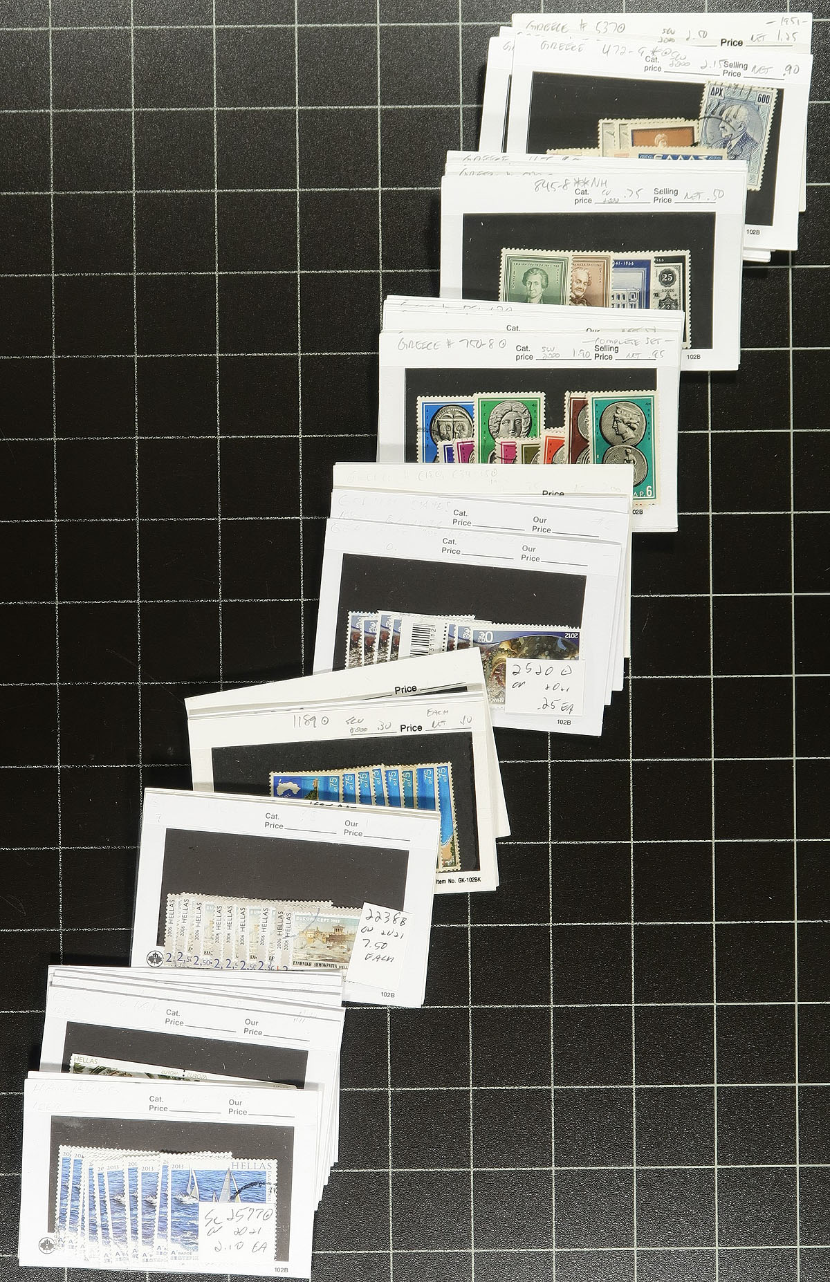 Two shoeboxes with a collector’s semi-organized mint and used duplicates, most in envelopes (many are in #102 cards, most are off paper, some are loose). Includes "back of the book" and most is 20th century material, all very clean with few faults to be expected and only moderate duplication in places. Lots of material in the $2.00-$20.00 catalogue value range, but there could easily be better material hiding here. A few thousand stamps in total. Perfect for collector or dealer. Estimate =