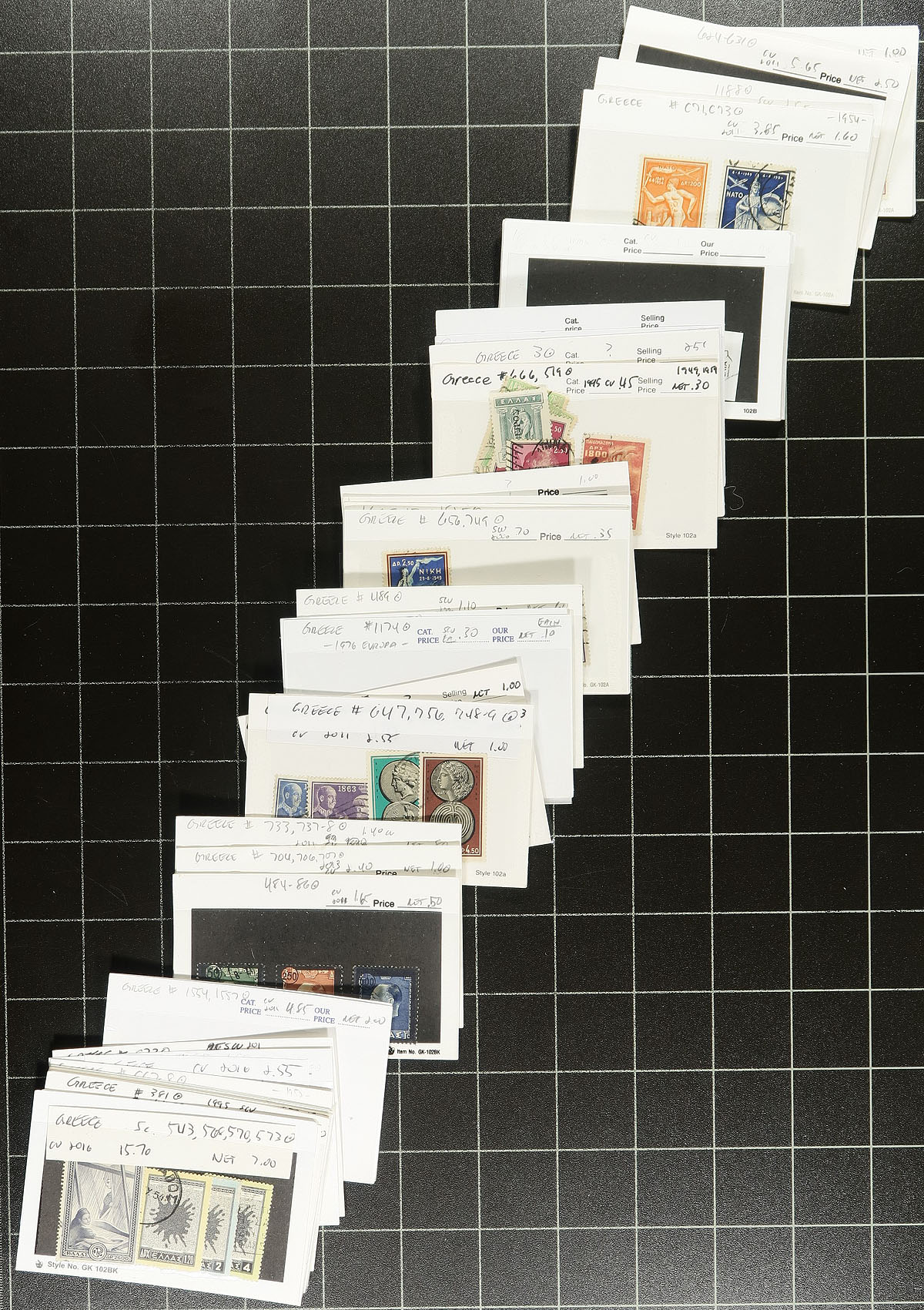 Two shoeboxes with a collector’s semi-organized mint and used duplicates, most in envelopes (many are in #102 cards, most are off paper, some are loose). Includes "back of the book" and most is 20th century material, all very clean with few faults to be expected and only moderate duplication in places. Lots of material in the $2.00-$20.00 catalogue value range, but there could easily be better material hiding here. A few thousand stamps in total. Perfect for collector or dealer. Estimate =