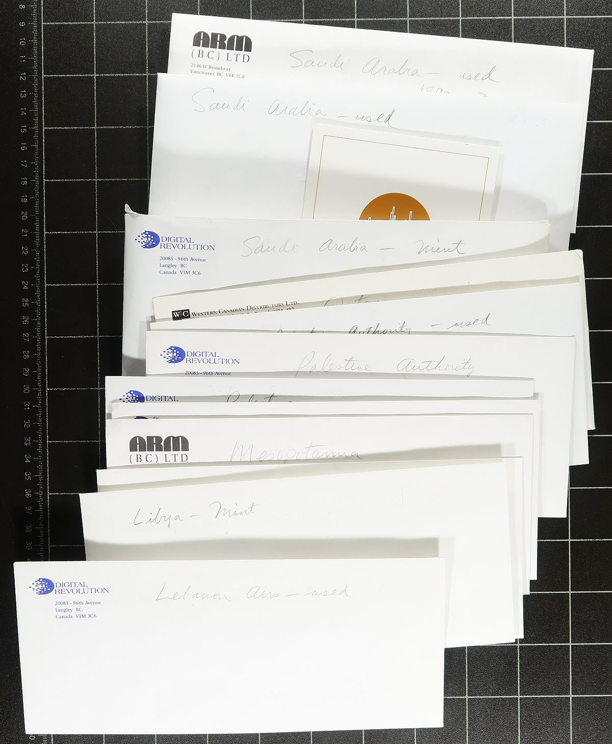 Middle East mint and used holding of a collector’s nicely organized duplicates. Mostly 20th century, sorted into envelopes by country, mint/used, era or "back of the book" category and all packed into a shoebox. Many countries represented including Aden, Ajman, Alaouites, Dubai, Egypt (strong), Iraq, Israel, Jordan, Kuwait, Lebanon, Libya, Mesopotamia, Oman, Palestine, Qatar, Saudi Arabia (lots), Sharjah, Syria, Turkey, UAE, Yemen and more! Thousands of stamps here and hours of fun, learning with lots of potential in each envelope. Estimate =