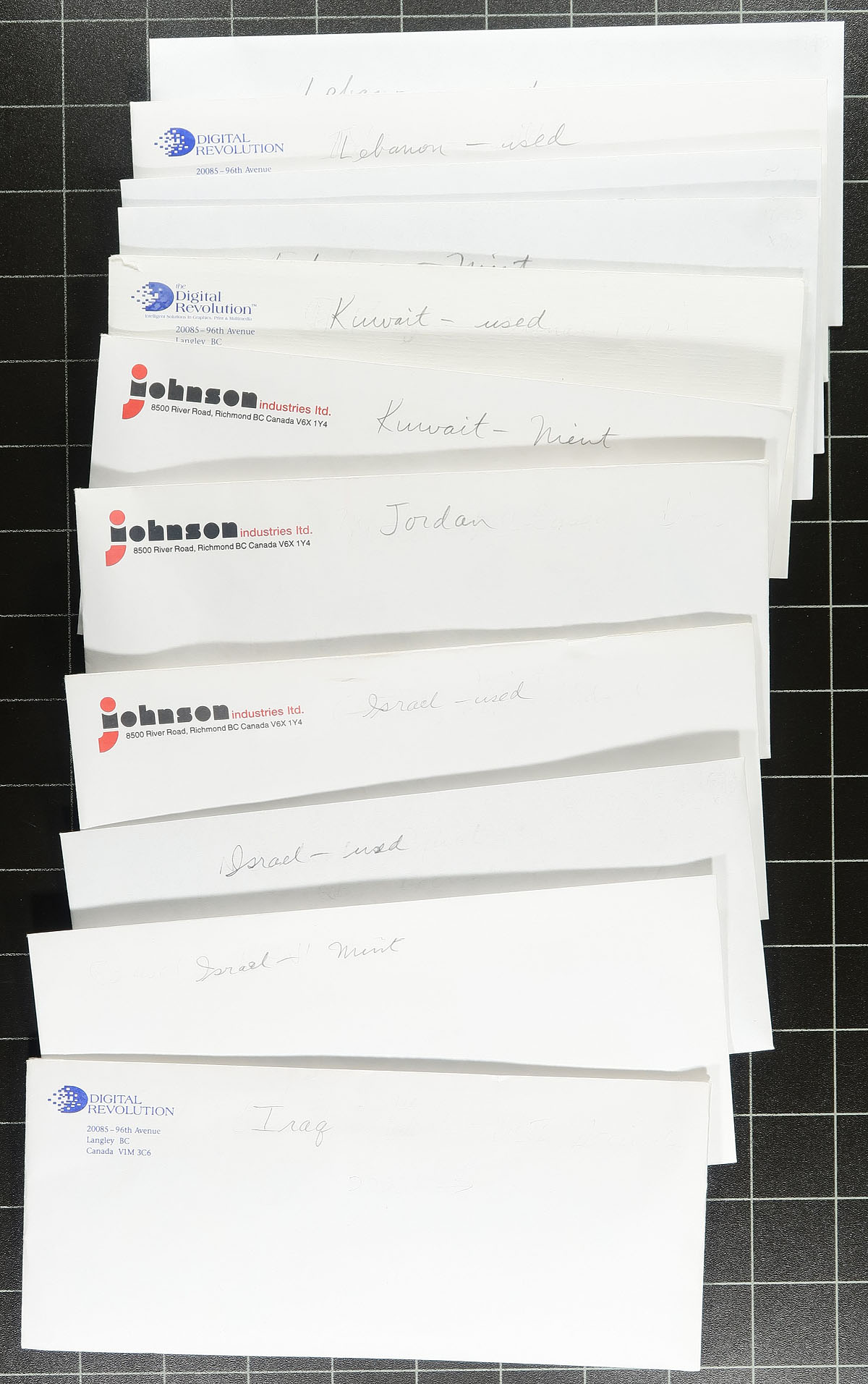 Middle East mint and used holding of a collector’s nicely organized duplicates. Mostly 20th century, sorted into envelopes by country, mint/used, era or "back of the book" category and all packed into a shoebox. Many countries represented including Aden, Ajman, Alaouites, Dubai, Egypt (strong), Iraq, Israel, Jordan, Kuwait, Lebanon, Libya, Mesopotamia, Oman, Palestine, Qatar, Saudi Arabia (lots), Sharjah, Syria, Turkey, UAE, Yemen and more! Thousands of stamps here and hours of fun, learning with lots of potential in each envelope. Estimate =