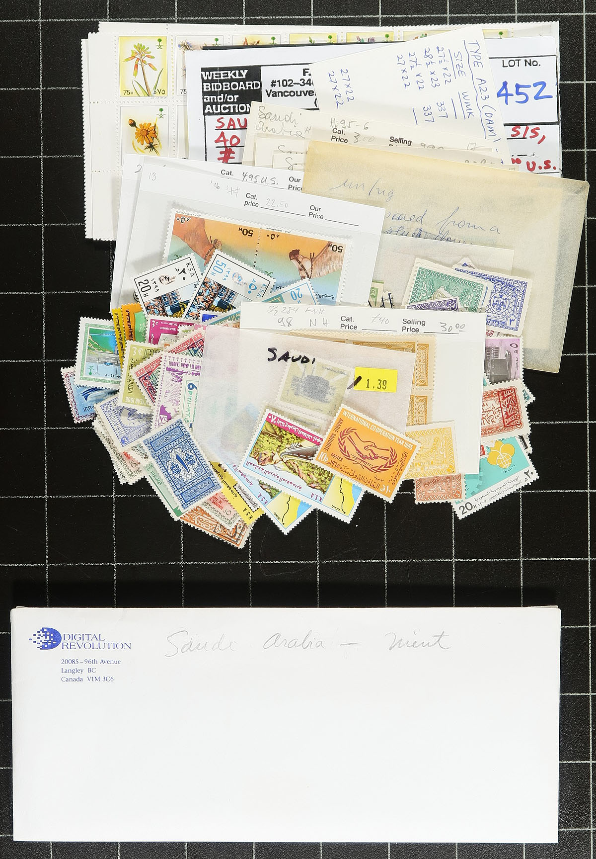 Middle East mint and used holding of a collector’s nicely organized duplicates. Mostly 20th century, sorted into envelopes by country, mint/used, era or "back of the book" category and all packed into a shoebox. Many countries represented including Aden, Ajman, Alaouites, Dubai, Egypt (strong), Iraq, Israel, Jordan, Kuwait, Lebanon, Libya, Mesopotamia, Oman, Palestine, Qatar, Saudi Arabia (lots), Sharjah, Syria, Turkey, UAE, Yemen and more! Thousands of stamps here and hours of fun, learning with lots of potential in each envelope.