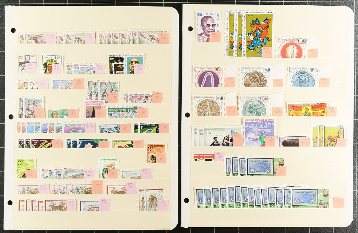 A stock representing the 20th century transition of this central African country from French colony to independence, up to the mid-1990's. With both mint and used on manila stockpages (up to 20 copies of a type) with current Scott numbers and older prices (easy to update). Substantial value here, such as a number of "Navigation and Commerce" issues (#24, #27, #29, #30, #31 - 4 mint copies each - almost $500.00 total catalogue value). The balance includes lots of topical issues and back of the book, with a bit of cancelled to order material. Overall condition is better than normally seen. Estimate =
