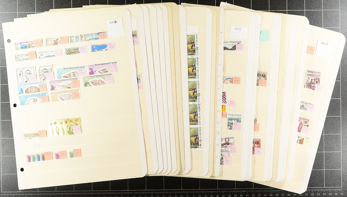 Part 1: "A" to "C" colonies. Collector’s neatly organized duplicates of several formerly French administered colonies in Africa. Mint and used, with up to a dozen of a type, with some nice cancels and items identified by Scott number and (older) catalogue values. We note: Afars and Issas (#C58-59, 2 sets), Burkina Faso (Upper Volta) - lots of "Camels", and some nice airmail and postage due material. Central African Republic has few duplicates, noting better air mails, and #M1-M2. Chad has some nice overprints, butterfly topicals, finishing with a bit of material from the Comoro Islands. Not often seen material, in very nice condition, with values that will add up quickly. Estimate =
