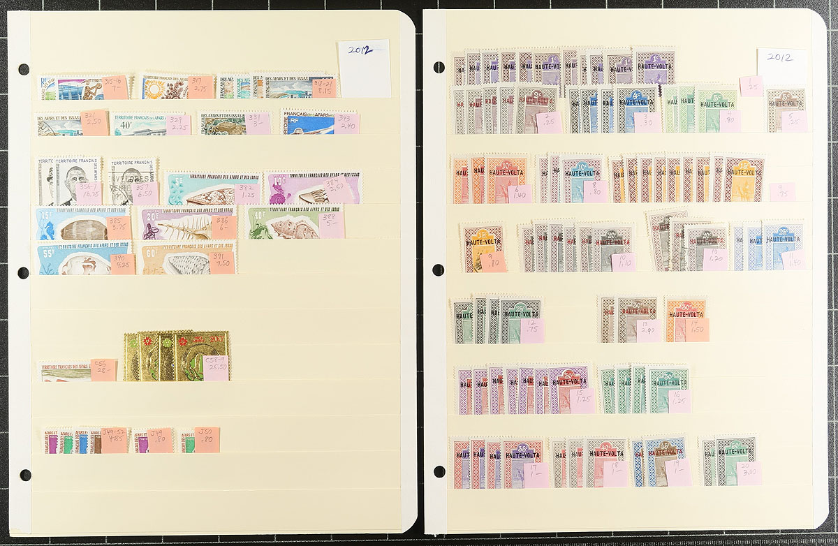 Part 1: "A" to "C" colonies. Collector’s neatly organized duplicates of several formerly French administered colonies in Africa. Mint and used, with up to a dozen of a type, with some nice cancels and items identified by Scott number and (older) catalogue values. We note: Afars and Issas (#C58-59, 2 sets), Burkina Faso (Upper Volta) - lots of "Camels", and some nice airmail and postage due material. Central African Republic has few duplicates, noting better air mails, and #M1-M2. Chad has some nice overprints, butterfly topicals, finishing with a bit of material from the Comoro Islands. Not often seen material, in very nice condition, with values that will add up quickly. Estimate =