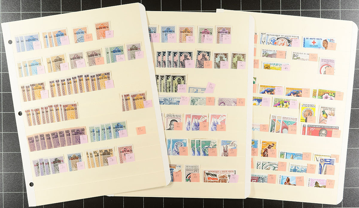 Part 1: "A" to "C" colonies. Collector’s neatly organized duplicates of several formerly French administered colonies in Africa. Mint and used, with up to a dozen of a type, with some nice cancels and items identified by Scott number and (older) catalogue values. We note: Afars and Issas (#C58-59, 2 sets), Burkina Faso (Upper Volta) - lots of "Camels", and some nice airmail and postage due material. Central African Republic has few duplicates, noting better air mails, and #M1-M2. Chad has some nice overprints, butterfly topicals, finishing with a bit of material from the Comoro Islands. Not often seen material, in very nice condition, with values that will add up quickly. Estimate =